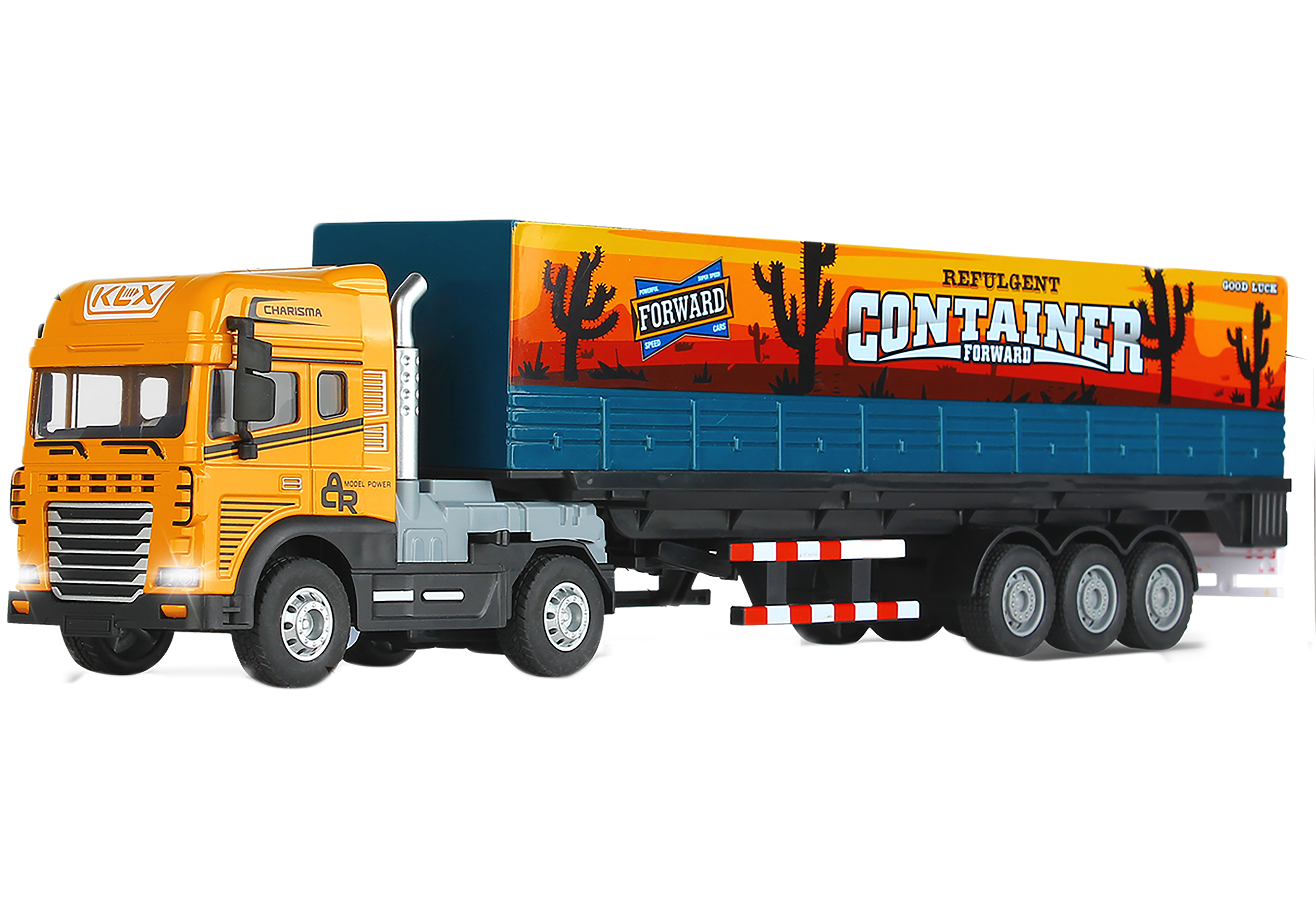 Auto kovové tahač s kontejnerem, s efekty. Délka 40 cm. Na setrvačník. Vydává světelné a zvukové efekty. Aktivace pohybem předních kol. Otevírací dvířka kontejneru. Páčka na uzamčení návěsu. Návěs je možné odpojit. Baterie 3xAG13, součástí balení.