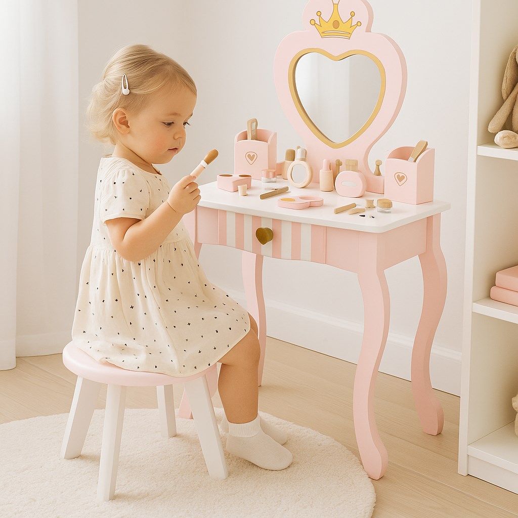 Toaletní stolek obsahuje bohaté vybavení, toaletní židličku a velké zrcadlo ve tvaru srdce. Stoleček nabízí spoustu úložného prostoru pro všechny poklady malé princezny.