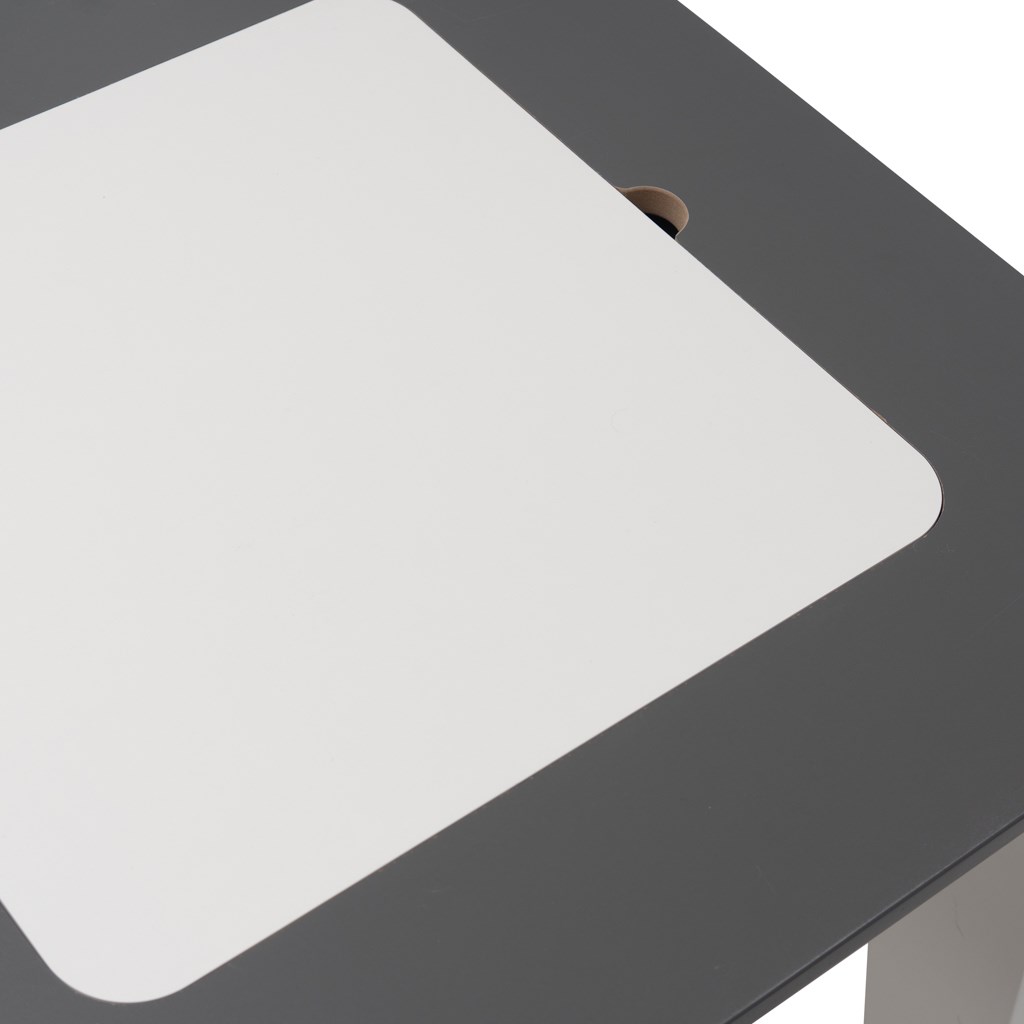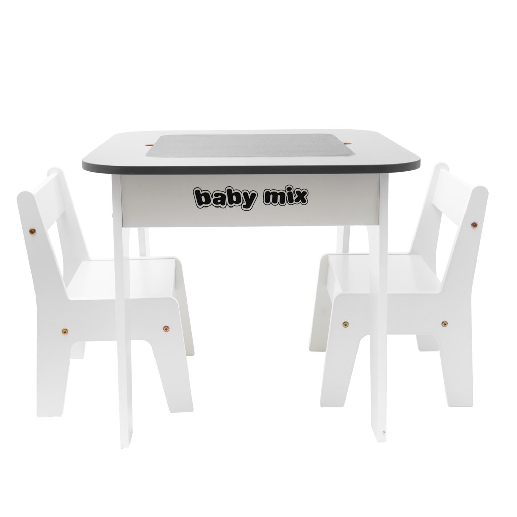 Součástí setu je stůl se dvěma židlemi vyrobený z odolného materiálu, který zajišťuje stabilitu a dlouhou životnost. Stůl je vybaven praktickou odnímatelnou deskou – pod ní se nachází úložný prostor, kam lze snadno schovat pastelky, papíry, drobné hračky nebo stavebnice. Děti tak mají potřebné věci vždy po ruce a zároveň udržují pořádek.