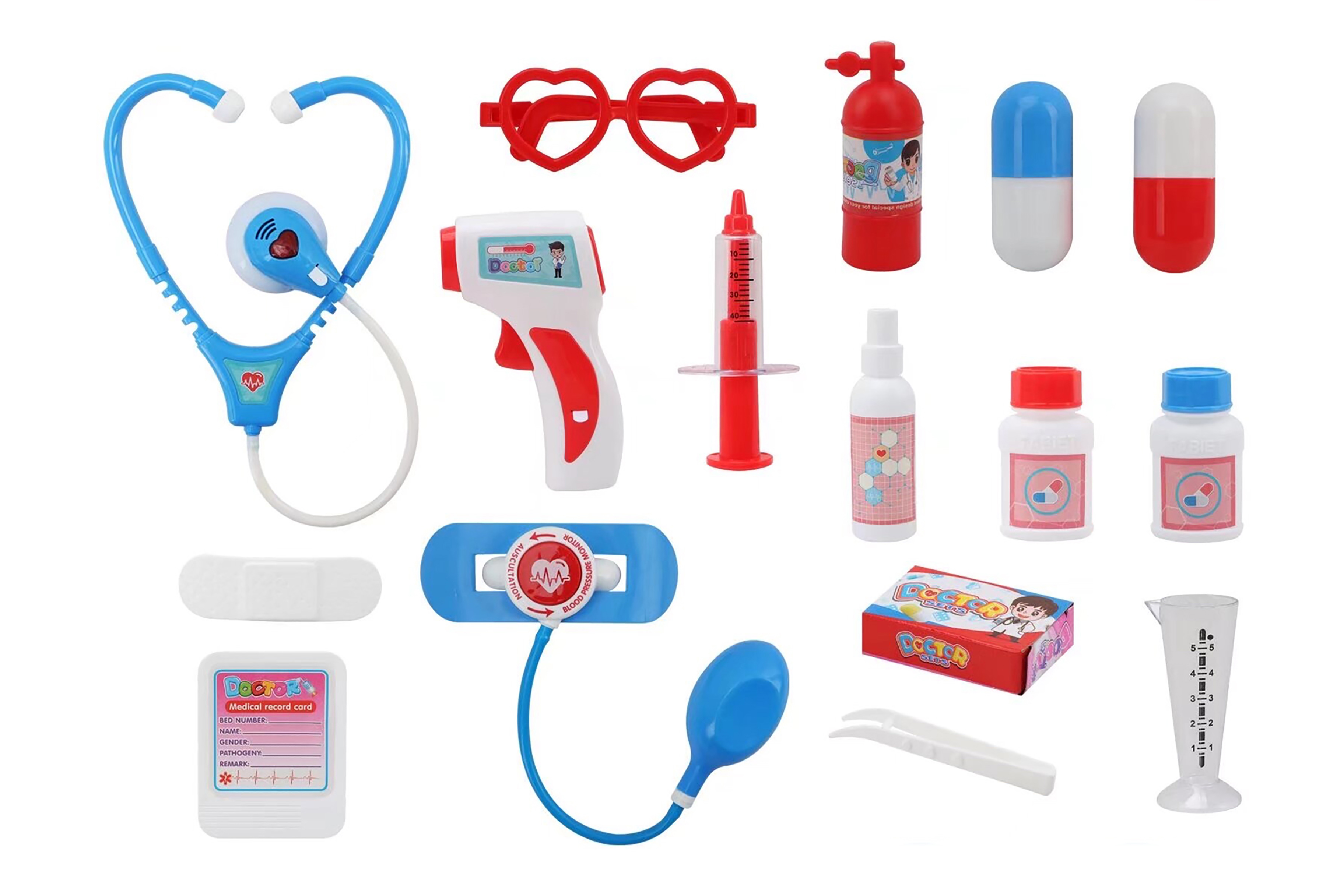 Doktorský kufřík. Velikost 30cm. Obsahuje fonendoskop, teploměr, stříkačku, pinzetu a další příslušenství pro hru na doktora. Baterie 4xAG10 součástí. Světelné efekty.
