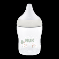 Kojenecká láhev NUK Perfect Match s kontrolou teploty a měkkou silikonovou savičkou. Speciální tvar typický pro savičky NUK s ortodontickou antikolikovou savičkou je modelován podle mateřské bradavky při kojení. Ponechává dostatek prostoru pro přirozené sací pohyby jazyka i čelisti. Velká, široká opora rtů při pití připomíná matčinu pokožku. Lahvička je navržena tak, aby miminko nepřišlo do kontaktu s pevnými plastovými částmi. Vylepšený systém proti polykání vzduchu při pití Anti Colic Air System zajišťuje přirozený tok mléka, aby dítě pilo uvolněně bez polykání vzduchu. Hladce se zužující tvar s antikolikovou funkcí pro plynulý a nerušený průtok pití, velikost S (od narození, pro mateřské mléko, čaj nebo vodu). Kojenecké láhve jsou nyní vybaveny novou NUK kontrolkou teploty a pomáhají tak zabránit tomu, aby vaše dítě pilo příliš horký příkrm. Kontrolka vypadá jako teploměr, je umístěna mezi ryskami a teplota obsahu láhve změní její barvu. Pokud je příkrm příliš horký, modrá kontrolka se změní na bílou. V ideálním případě by měl příkrm mít tělesnou teplotu (37 °C), což odpovídá modrému zabarvení displeje. Vyrobena z vysoce kvalitního nerozbitného plastu polypropylenu a neobsahuje BPA (Bisfenol A). Obsah láhve 150 ml. Vhodná pro děti od narození, S (malý otvor = pro mateřské mléko, vodu, čaj). Klinicky testováno.