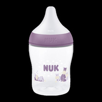 Kojenecká láhev NUK Perfect Match s kontrolou teploty a měkkou silikonovou savičkou. Speciální tvar typický pro savičky NUK s ortodontickou antikolikovou savičkou je modelován podle mateřské bradavky při kojení. Ponechává dostatek prostoru pro přirozené sací pohyby jazyka i čelisti. Velká, široká opora rtů při pití připomíná matčinu pokožku. Lahvička je navržena tak, aby miminko nepřišlo do kontaktu s pevnými plastovými částmi. Vylepšený systém proti polykání vzduchu při pití Anti Colic Air System zajišťuje přirozený tok mléka, aby dítě pilo uvolněně bez polykání vzduchu. Hladce se zužující tvar s antikolikovou funkcí pro plynulý a nerušený průtok pití, velikost S (od narození, pro mateřské mléko, čaj nebo vodu). Kojenecké láhve jsou nyní vybaveny novou NUK kontrolkou teploty a pomáhají tak zabránit tomu, aby vaše dítě pilo příliš horký příkrm. Kontrolka vypadá jako teploměr, je umístěna mezi ryskami a teplota obsahu láhve změní její barvu. Pokud je příkrm příliš horký, modrá kontrolka se změní na bílou. V ideálním případě by měl příkrm mít tělesnou teplotu (37 °C), což odpovídá modrému zabarvení displeje. Vyrobena z vysoce kvalitního nerozbitného plastu polypropylenu a neobsahuje BPA (Bisfenol A). Obsah láhve 150 ml. Vhodná pro děti od narození, S (malý otvor = pro mateřské mléko, vodu, čaj). Klinicky testováno.