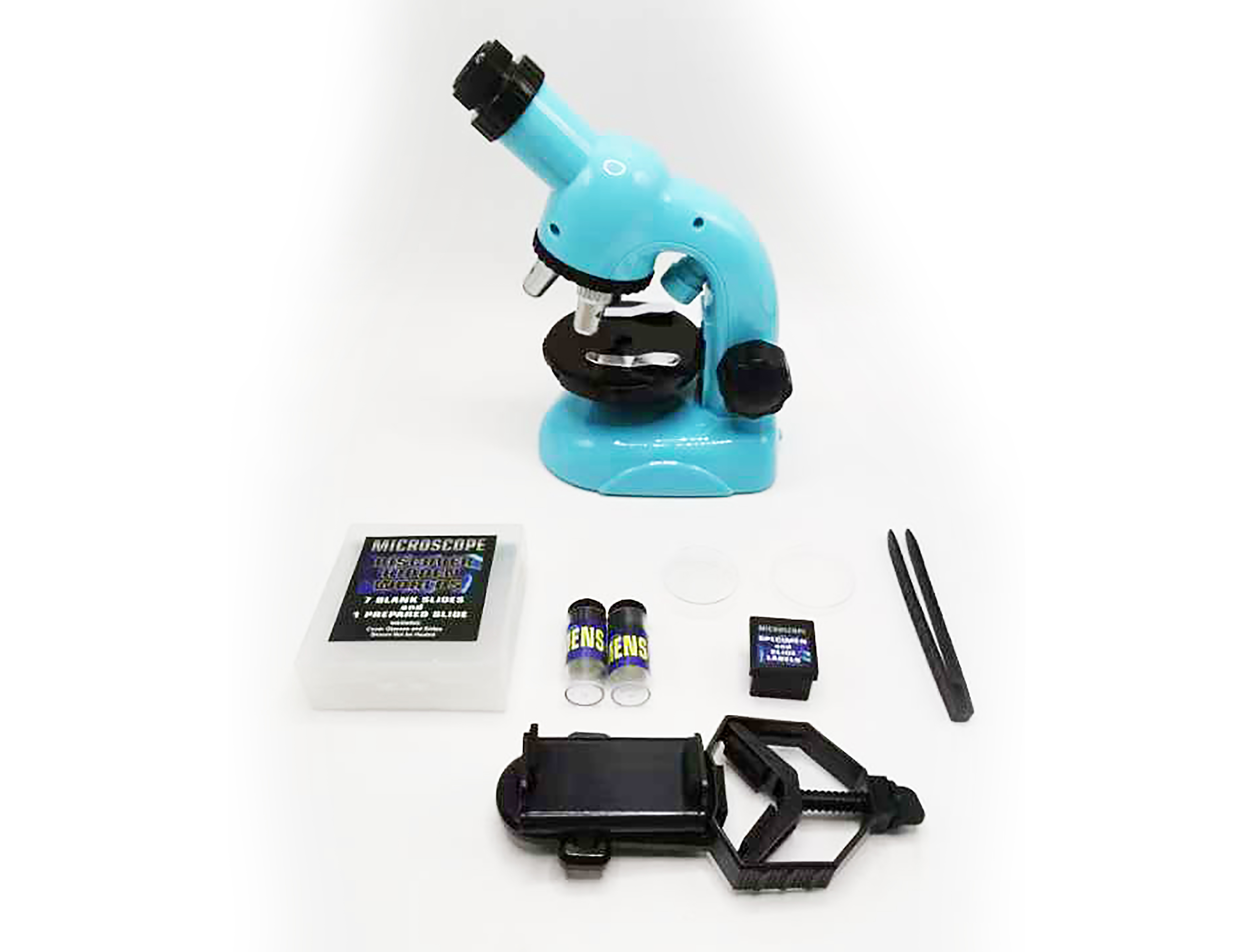 Mikroskop. Velikost 21cm. Zvětšení 10x, 400x, 1200x. Baterie 2xAA není součástí. Obsahuje mikroskop, držák na mobilní telefon, sadu sklíček, krabičku na sklíčka, pinzetu, misky a lahvičky. Možnost připevnit držákem mobilní telefon a fotit zvětšené vzorky.
