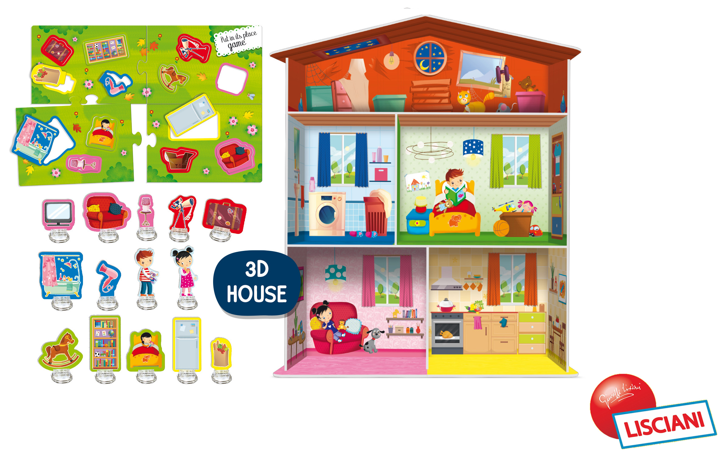 Sestavte si krásný dům. Obsah balení: domeček, puzzle ve tvaru vybavení, 15 stojánků na kartičky Doporučený věk: od 3 let