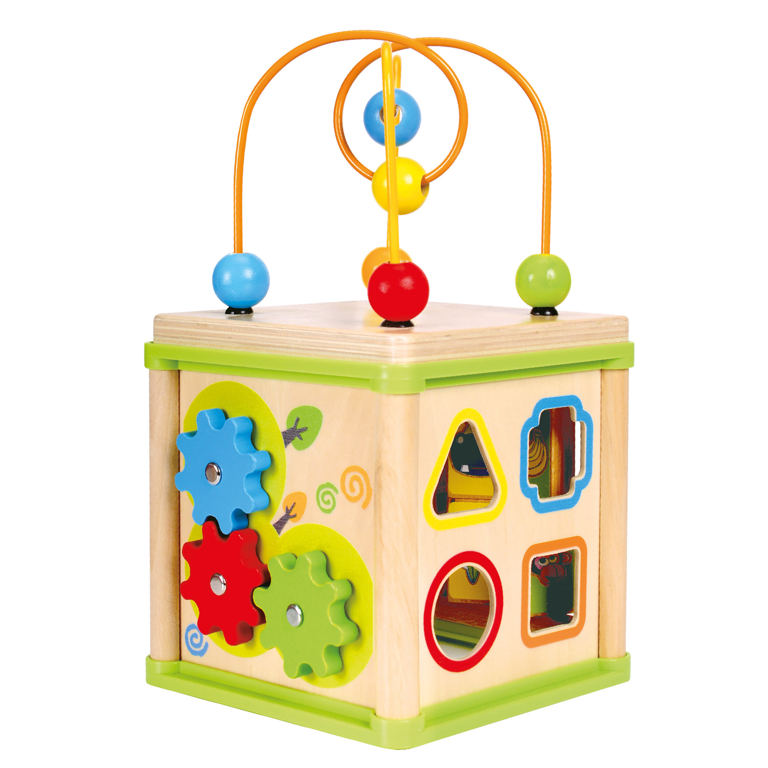 Multifunkční motorická kostka je kvalitní hračkou pro malé šikulky. Díky rozmanitým aktivitám, které mohou děti na každé stěně kostky plnit, procvičují jemnou motoriku ruky, logiku a soustředěnost. Materiál: Dřevo a plast