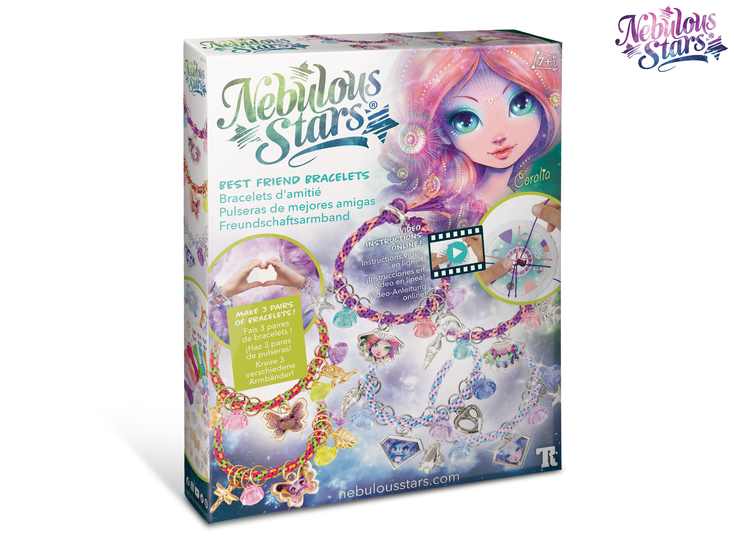 Nebulous Stars Náramky přátelství Coralia. Set na výrobu náramků přátelství. Obrázkový návod na 3 vzory náramků v balení. Obsah balení - bavlnky 7 barev, 18 přívěšků, 18 korálků, 6 epoxidových samolepek, 60 kroužků, 6 sponek, příběh, návod.
