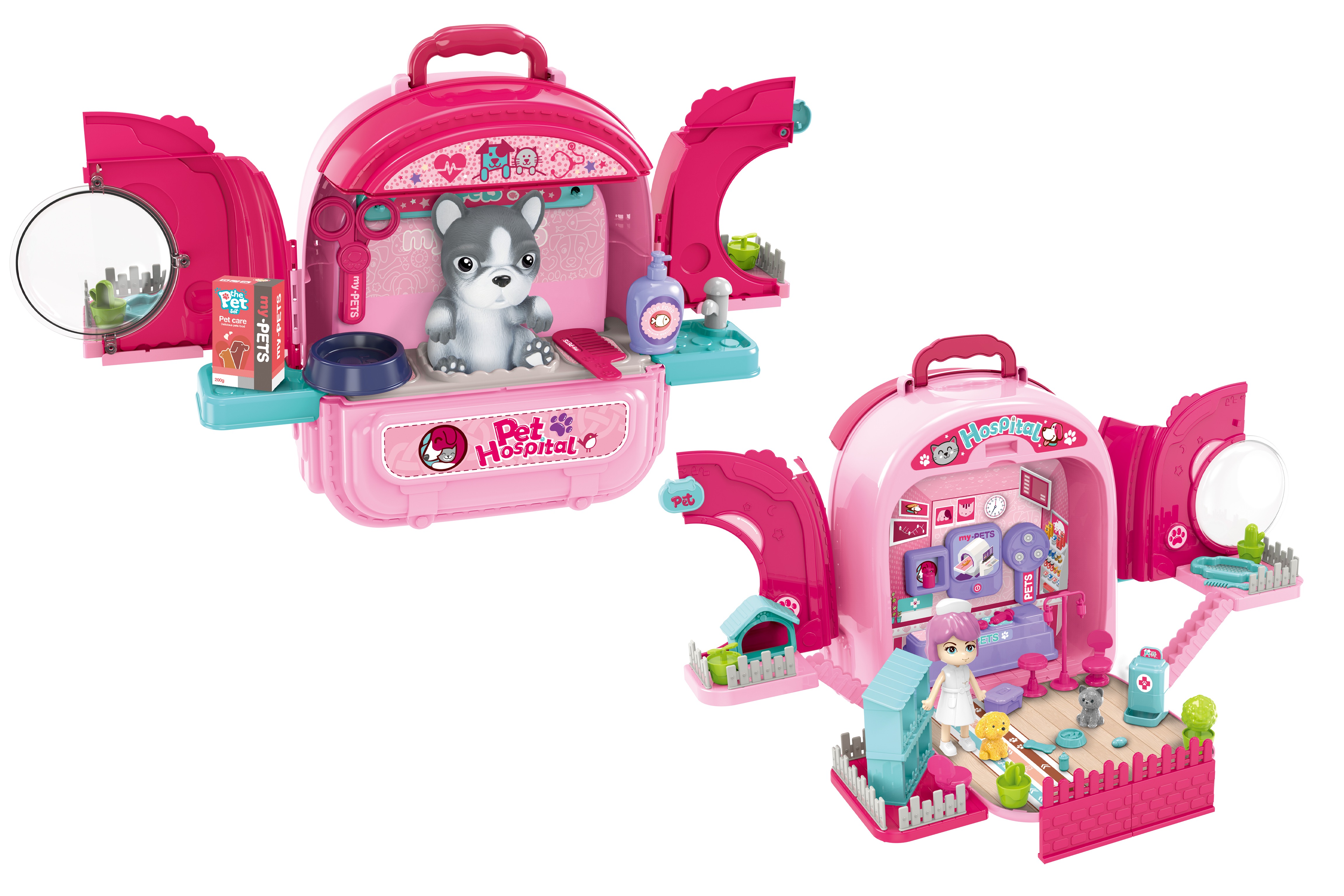Nemocnice zvířecí v batohu pejsek. Rozměry 50x35x30 cm. Velikost pejska 17 cm. Batoh je otevírací ze dvou stran. Balení obsahuje zařízení zvířecí ordinace, figurku pejska a příslušenství: misku, lahvičky, panenku zdravotní sestru, drobnosti do ordinace.