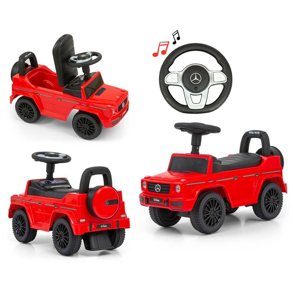 Dětské odrážedlo MERCEDES G350d je vyrobeno v licenci koncernu MERCEDES. Váš malý závodník či závodnice se v něm bude cítit jako v opravdovém džípu. Odrážedlo je vyrobeno s důrazem na každý detail a kvalitu použitých materiálů. Jeho vzhled upoutá pozornost nejen každého dítěte, ale i rodiče. Odrážedlo pomáhá rozvíjet motorické schopnosti dítěte a Váš malý závodník či závodnice si s ním užije spoustu zábavy a legrace. Autíčko má na tříramenném volantu tlačítka vydávající různé melodie, zvuk motoru nebo houkačku. Je určeno jak pro nejmenší děti, které už umí sedět, tak i pro děti, které se už naučily chodit. Odrážedlo má otočná přední kola a široké a komfortní sedadlo s úložným prostorem. Baterie nejsou součástí balení (2x AA 1.5V).