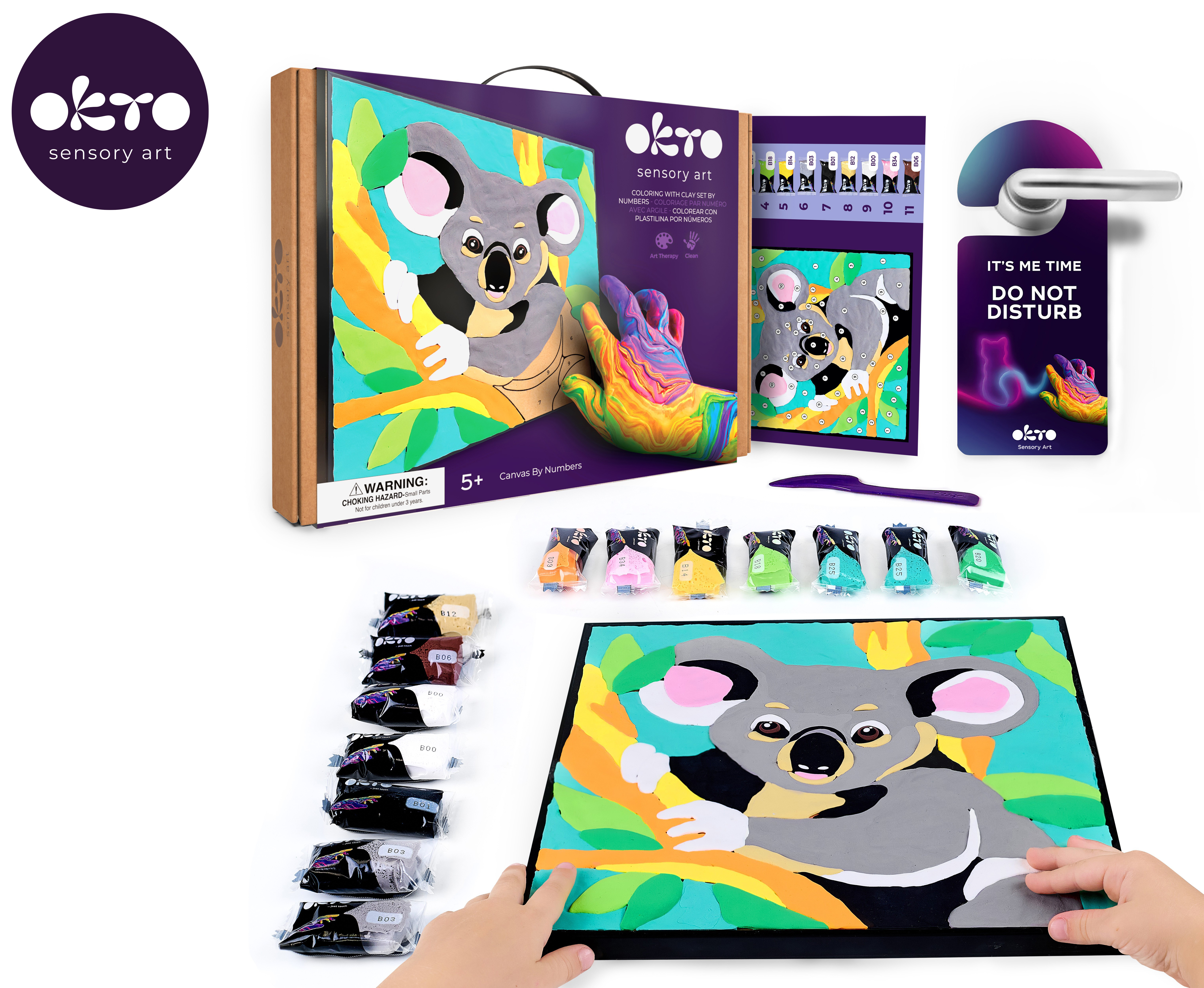 OKTO Malování hmotou podle čísel "Koala". Velikost plátna 29x29 cm. Vytvarujte obrázek podle čísel. Obsah balení - plátno, obrázkový návod, modelovací nástroj, sada barevných tvarovacích směsí 14 ks.