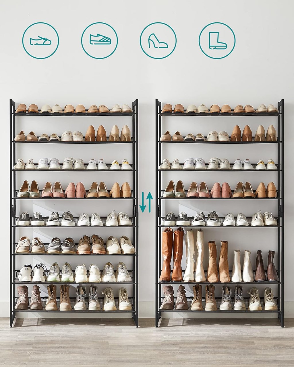 Obsahuje osm polic na boty (2 spojené regály po 4 police), které dle velikosti obuvi pojmou až 40 párů.