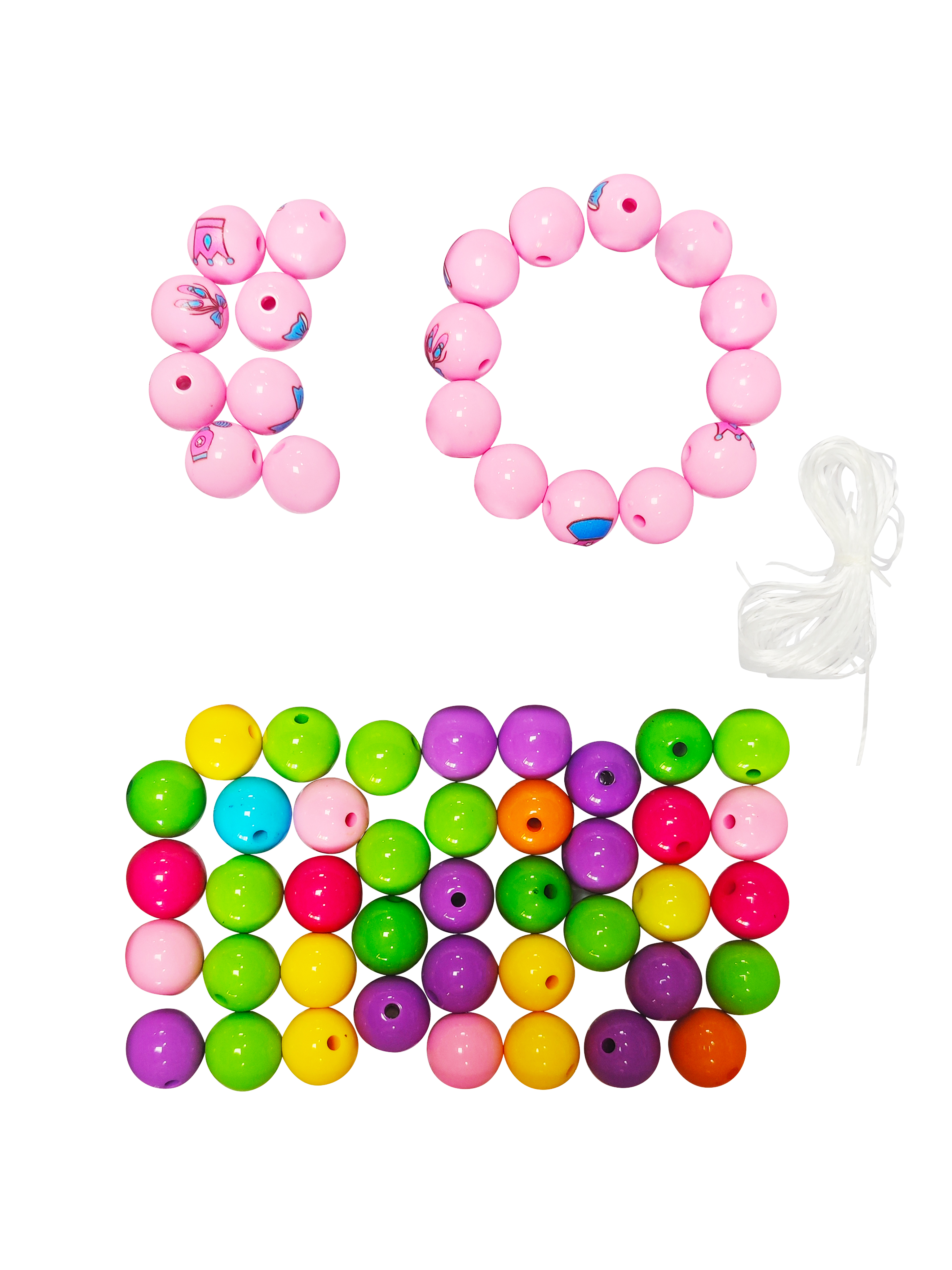 Tvorba náramků korálky. Obsahuje kolárky různých barev a růžové korálky s obrázky.