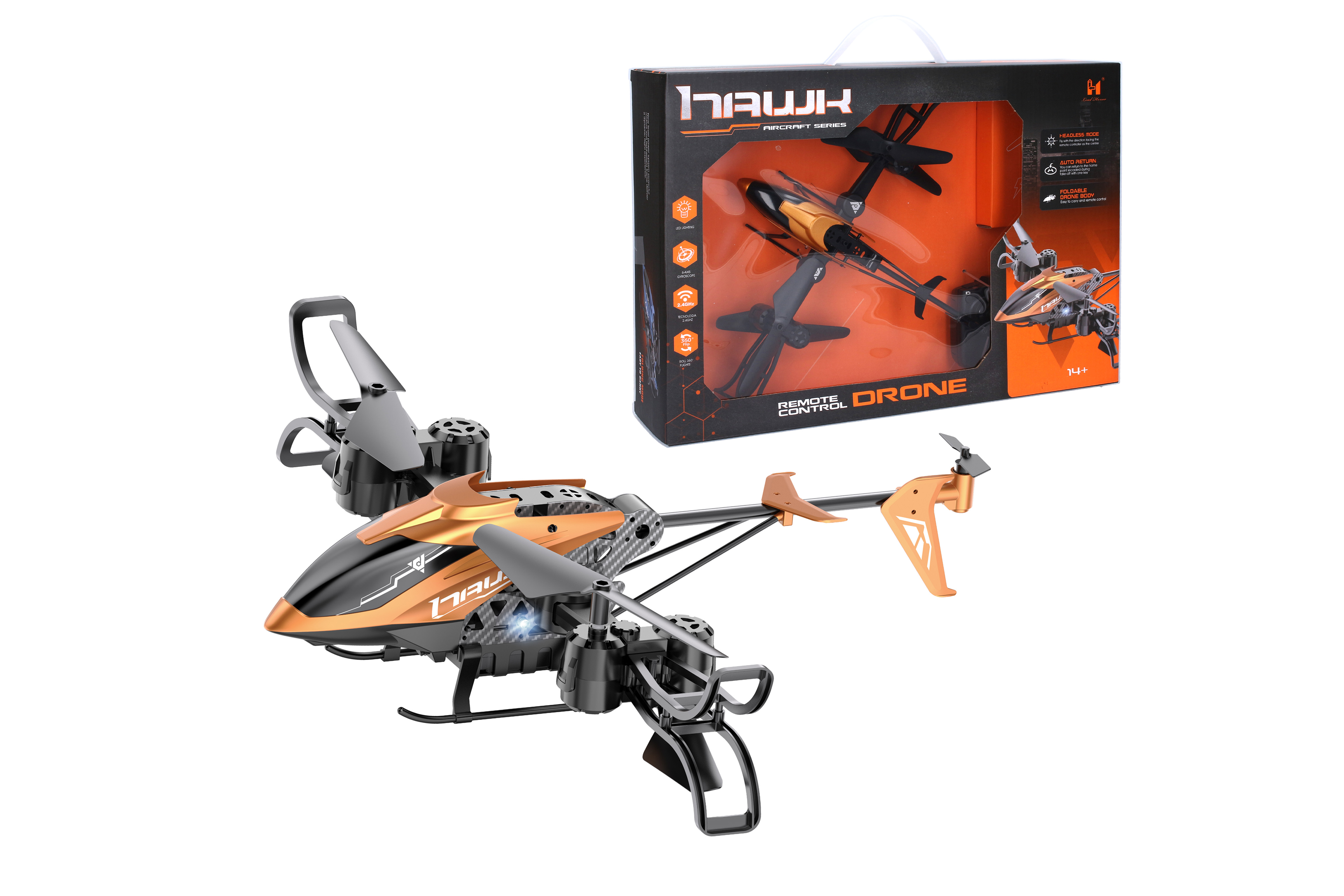 Vrtulník se sklopnými křídly RC na dálkové ovládání. Rozměry 26x32x7 cm. Délka 26 cm, rozpětí křídel 32 cm. Frekvence 2.4 GHz. Sklopná křídla, přemet o 360 stupňů, nastavení rychlosti, vzlet a přistání tlačítkem, navrácení do výchozího bodu. Světelné efekty. Bateriový pack 3.7V 580mAh do vrtulníku součástí, 3xAA do ovladače nejsou součástí. USB kabel a náhradní křídla součástí. Přepínač ON/OFF na boční straně vrtulníku a na ovladači. Nabíjení 80-100 min, dosah 50 m.