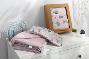 Sada do postýlky je kombinací vysoce kvalitního mušelínu na jedné straně a potištěné bavlny na straně druhé. Skládá se z oboustranného plochého polštáře a peřinky s výplní. Kombinace přírodních a vzdušných látek je ideální pro použití v dětské postýlce, nosítku nebo kolébce. Je vyplněn antialergickým silikonovým rounem. Sada je zabalena ve vkusné kartonové krabici, která je jako stvořená pro dárek.