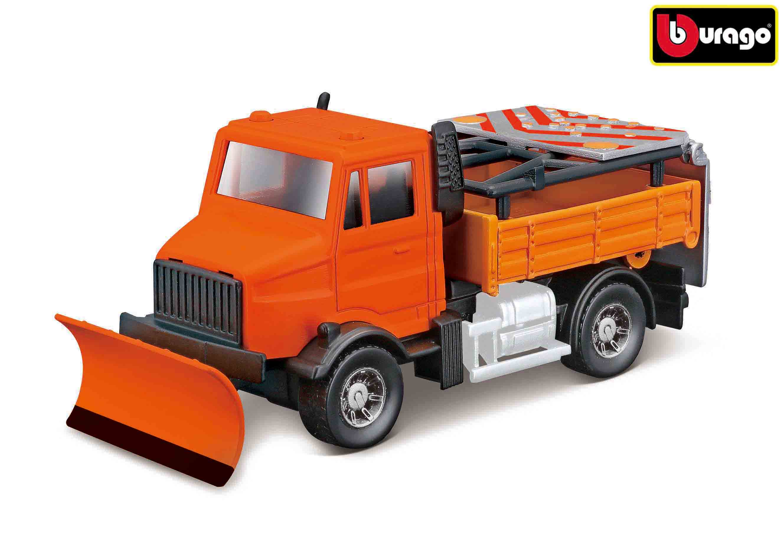 Kovový model ze serie Bburago 1:43 servisní vozidlo Silniční zabezpečení se sněžným pluhem a signalizační deskou