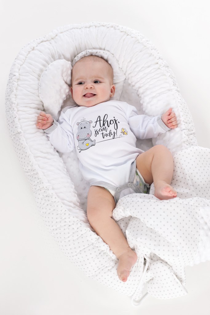 Originální bavlněné kojenecké body s dlouhým rukávem, New Baby s roztomilým obrázkem a nápisem Ahoj, jsem tady! Body má kolem krčku, nožiček a ručiček barevné lemování. Barvy použité k potisku jsou certifikované a vhodné pro miminka. Je vyrobeno z příjemného a kvalitního materiálu, ve kterém se bude Vaše miminko cítit příjemně. Body má zapínáni na cvočky na ramínku a mezi nožičkami, což usnadňuje oblékání a přebalování. Dopřejte Vašemu miminku vyniknout v originálním body. Složení: 100% bavlna. Rozměry: obvod kolem hrudníku cca 46 cm, délka rukávu cca 24 cm, celková délka cca 40 cm.