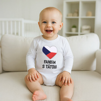 Originální bavlněné kojenecké body s dlouhým rukávem New Baby, s vtipným nápisem Fandím s tátou a obrázkem české vlajky. Body má kolem krčku, nožiček a ručiček barevné lemování. Barvy použité k potisku jsou certifikované a vhodné pro miminka. Je vyrobeno z příjemného a kvalitního materiálu, ve kterém se bude Vaše miminko cítit příjemně. Body má zapínáni na cvočky na ramínku a mezi nožičkami, což usnadňuje oblékání a přebalování. Dopřejte Vašemu miminku vyniknout v originálním body. Složení: 100% bavlna. Rozměry: obvod kolem hrudníku cca 36 cm, délka rukávu cca 18 cm, celková délka cca 32 cm.
