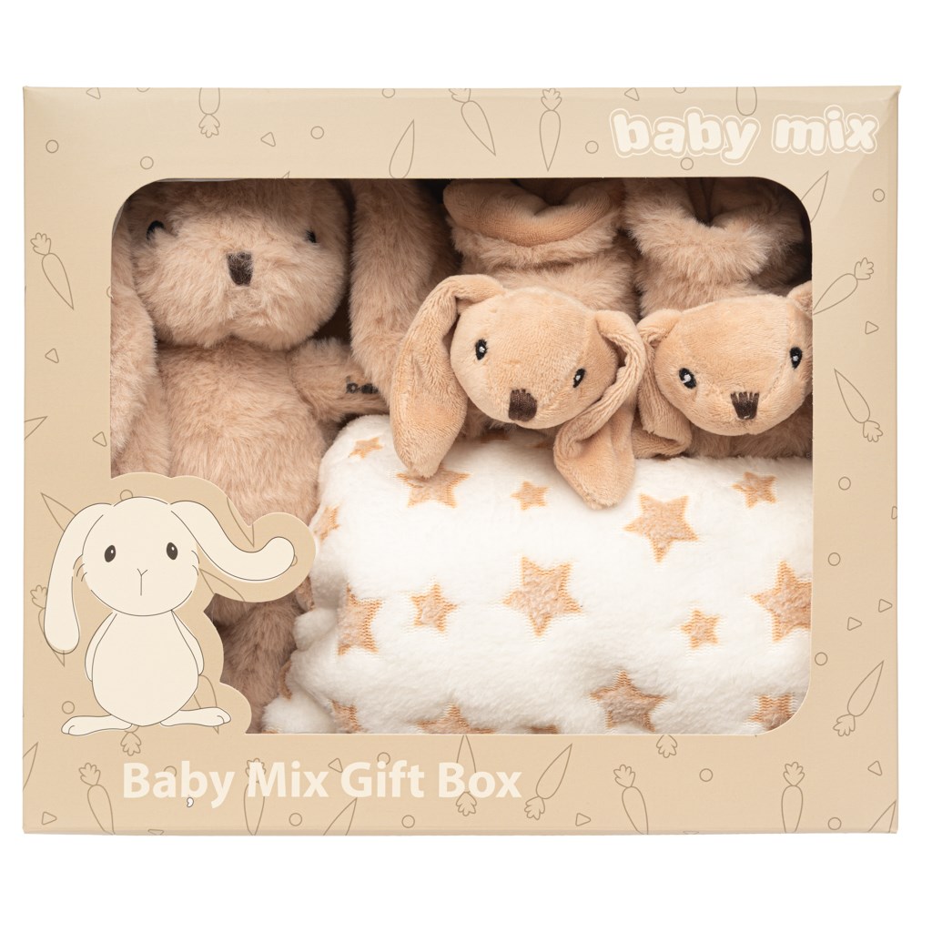 Roztomilá dárková sada Baby Mix je ideálním dárkem pro novorozence nebo miminko - spojuje útulnost, měkkost a výjimečný půvab. V sadě najdete plyšového králíčka v hnědé barvě, měkoučkou dečku o velikosti 70 × 70 cm a sladké botičky o délce 10 cm, které dohromady tvoří harmonický, přítulný komplet.