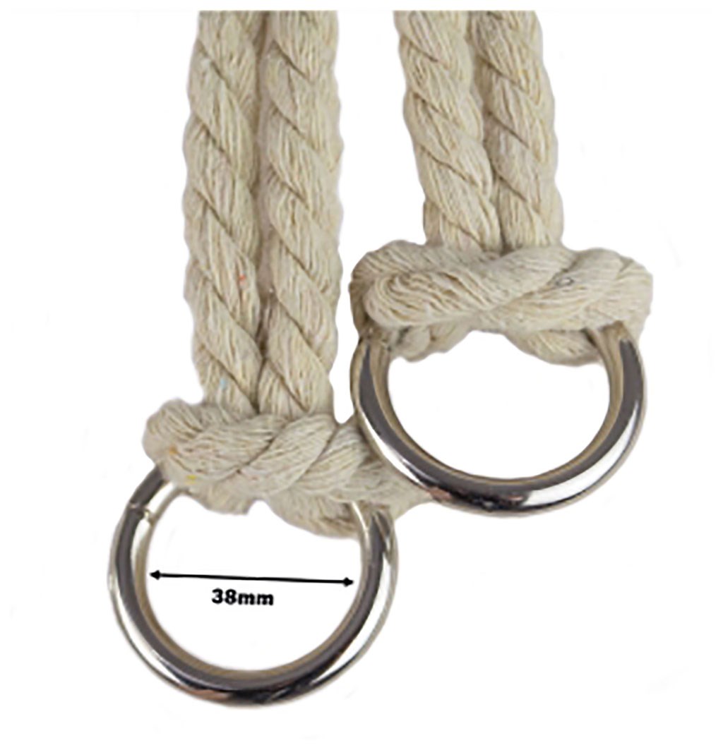 Hrubé bavlněné provazy jsou vybaveny kovovými kroužky na zavěšení a zakončeny ozdobnými třásněmi.