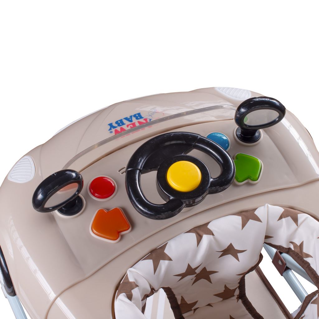 Dětské chodítko s houpačkou NEW BABY v moderním designu malého autíčka se čtyřmi kolečky a šesti bezpečnostními podložkami pomáhá dítěti se stabilitou při chůzi a zároveň přináší svět zábavy díky hracímu pultíku a možnosti jednoduché přestavby na houpačku. Interaktivní hrací pultík obsahuje volant, otáčecí zrcátka, vydává zvuky, svítí a lze jej vyjmout pro přístup k jídelnímu pultu. Chodítko je nastavitelné do několika poloh a má velice pohodlný potah, který lze vyprat a je v zadní části vyztužený. Vyrobeno z kvalitního plastového materiálu.
