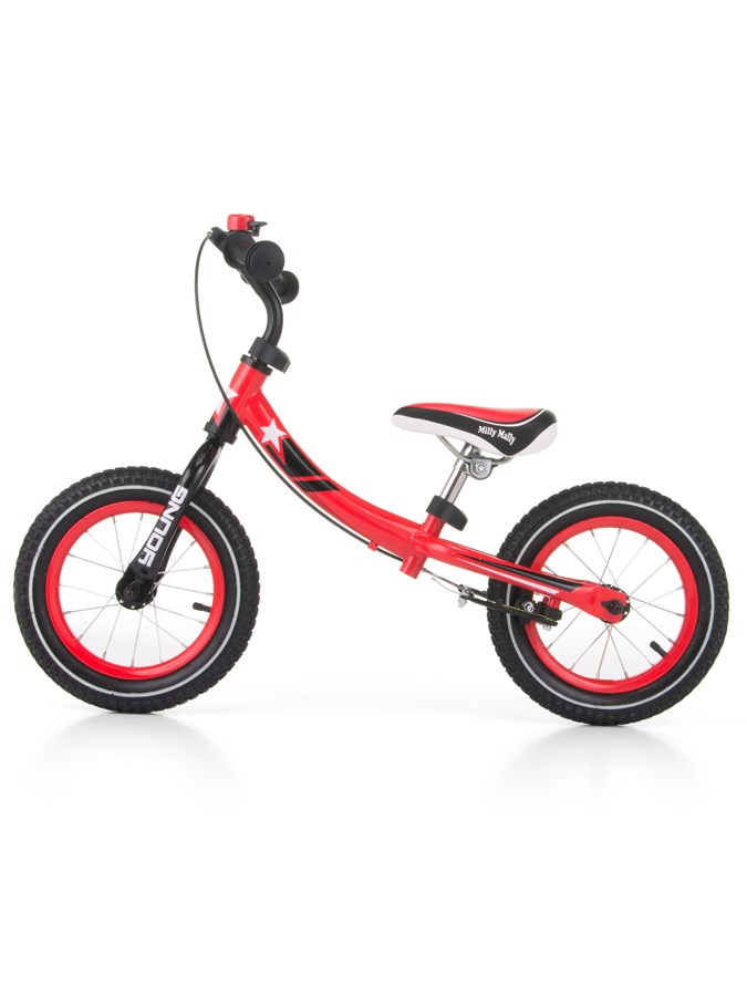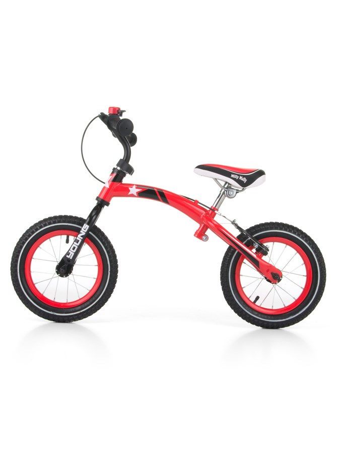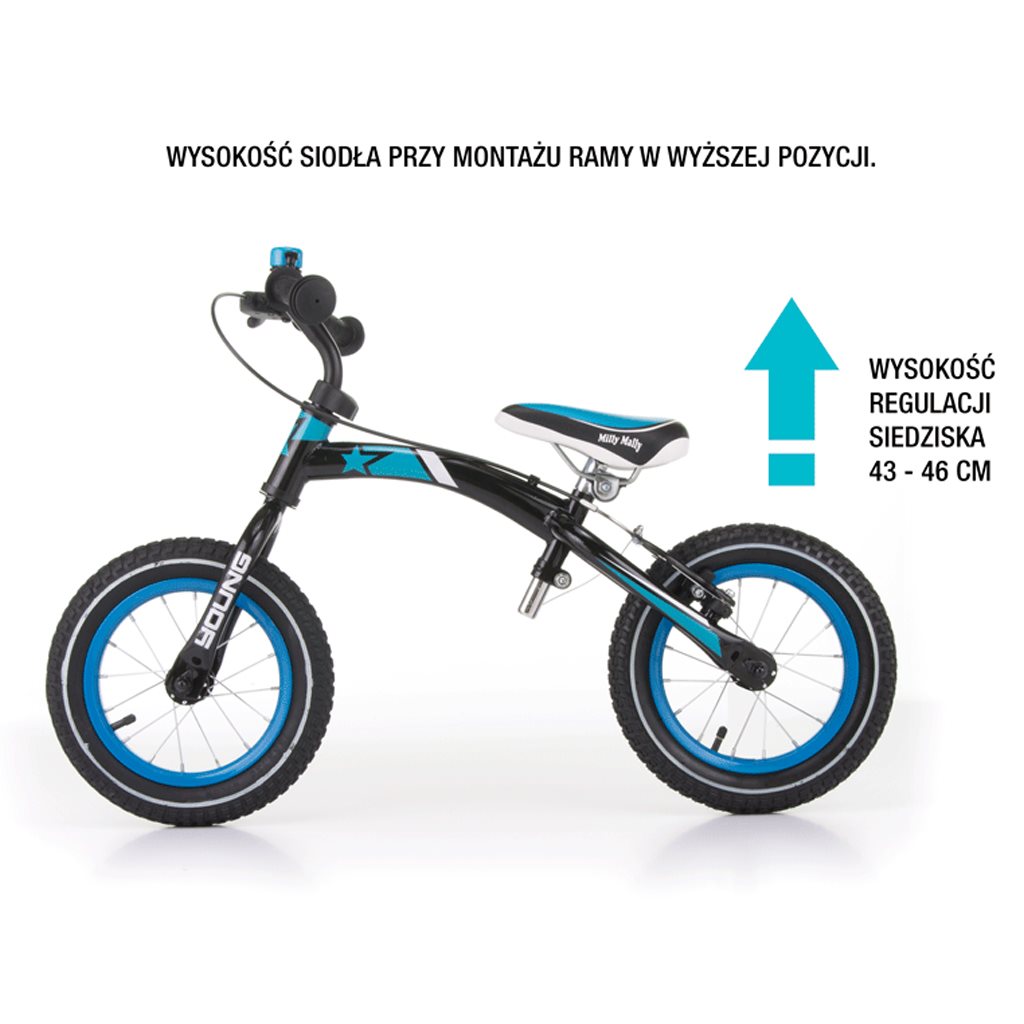 Dětské odrážedlo-kolo Milly Mally Young. Odrážedlo-kolo je ideální, když se dítě učí udržet rovnováhu. Je tou nejlepší alternativou pro kolo s bočními kolečky, takže pozdější jízda na klasickém kole bude mnohem jednodušší. Kolo je bez pedálů, díky čemuž se dítě dokáže soustředit hlavně na držení rovnováhy a směr jízdy. Má brzdu, pohodlné sedadlo a pevný kvalitní rám, který lze otočit, a tak bude mít Vaše dítě více pohodlí při nasedání.