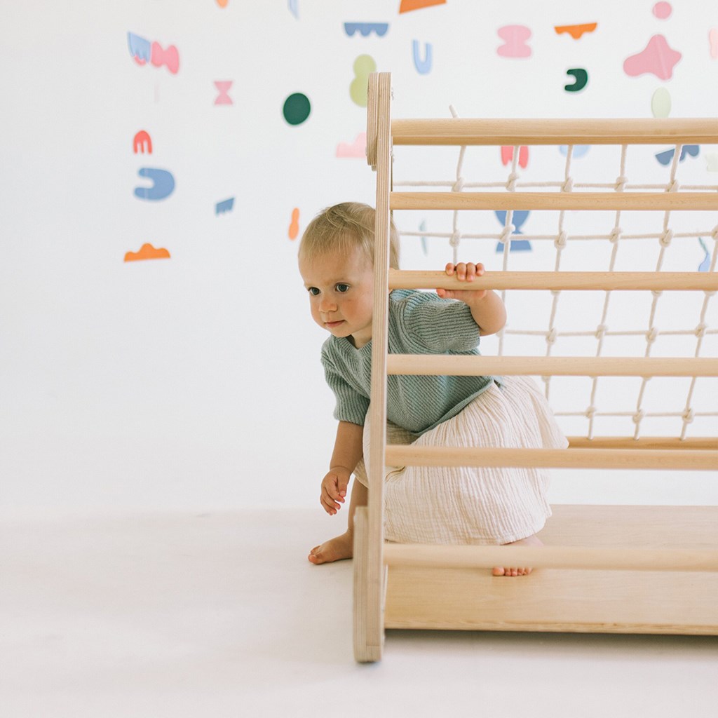 Barevné lezecké chyty – v příjemných pastelových barvách a zajímavých tvarech, perfektně vhodné pro malé ručičky. Lezecká síť – podporuje lezení a motorickou koordinaci. Stimulace představivosti – žebřík se může stát horou, podstavcem, obchodem nebo domečkem na hraní – jediným limitem je dětská fantazie.
