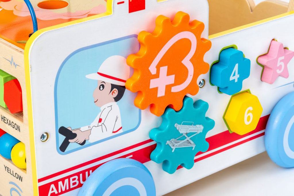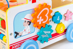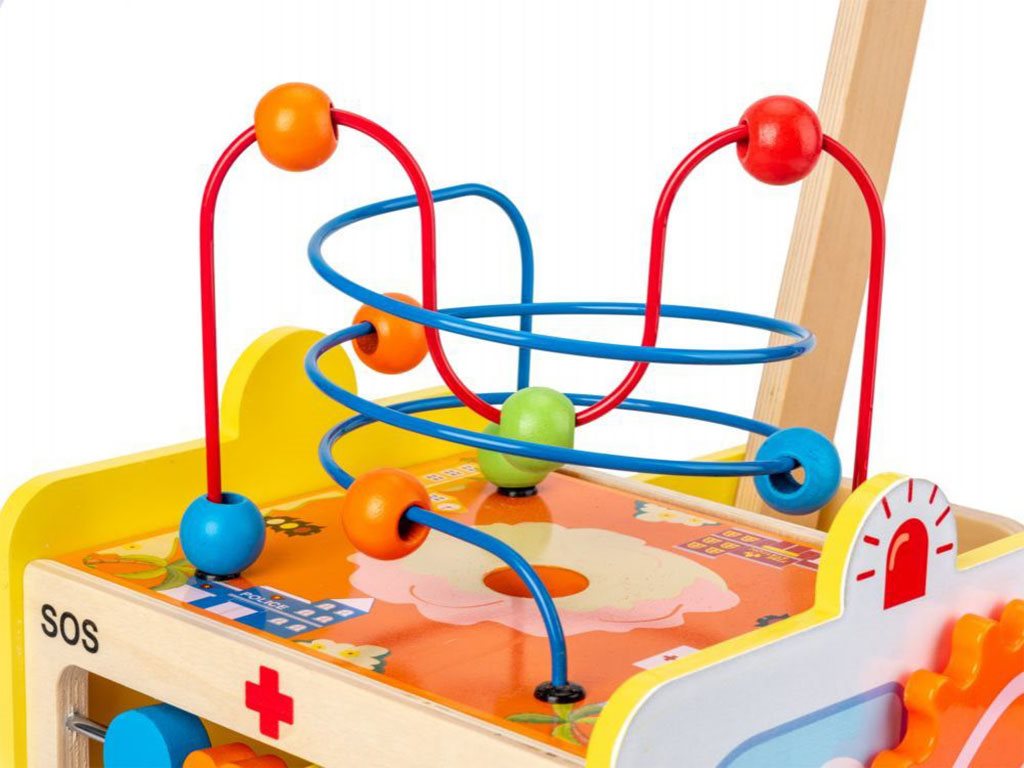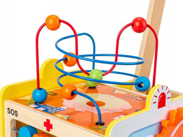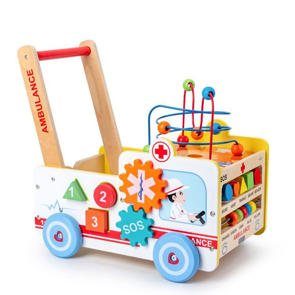 Dětské dřevěné chodítko má motiv sanitky. Dřevěná rukojeť je ve výšce 40 cm, což umožňuje naučit se chodit. Chodítko má protiskluzová kolečka, která nepoškrábou povrch a zajistí stabilitu při hře. Kromě učení chůze je hračka také vzdělávací hračkou. Po jejích stranách se nachází třídička se 6 kostkami, počítadlo, mula bludiště a pohyblivé převody.