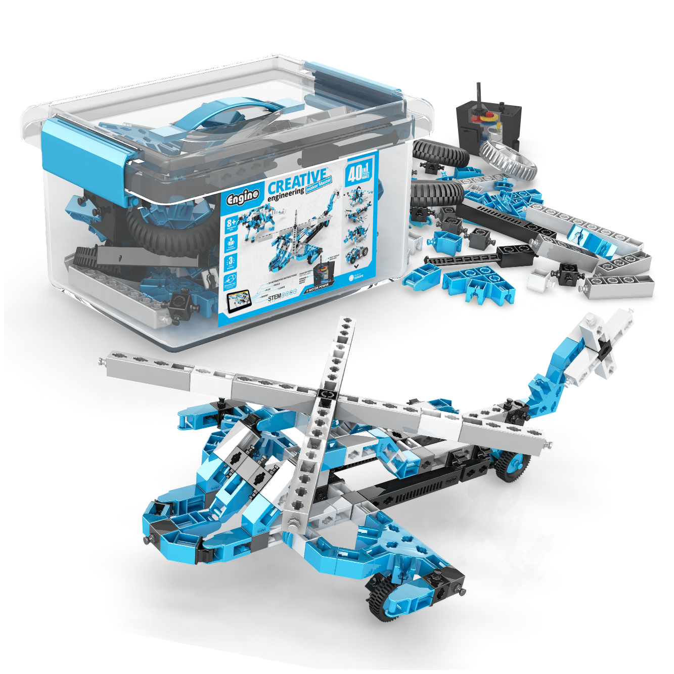 možnost sestavit 40 modelů, aplikace Engino kidCAD zobrazující 3D model