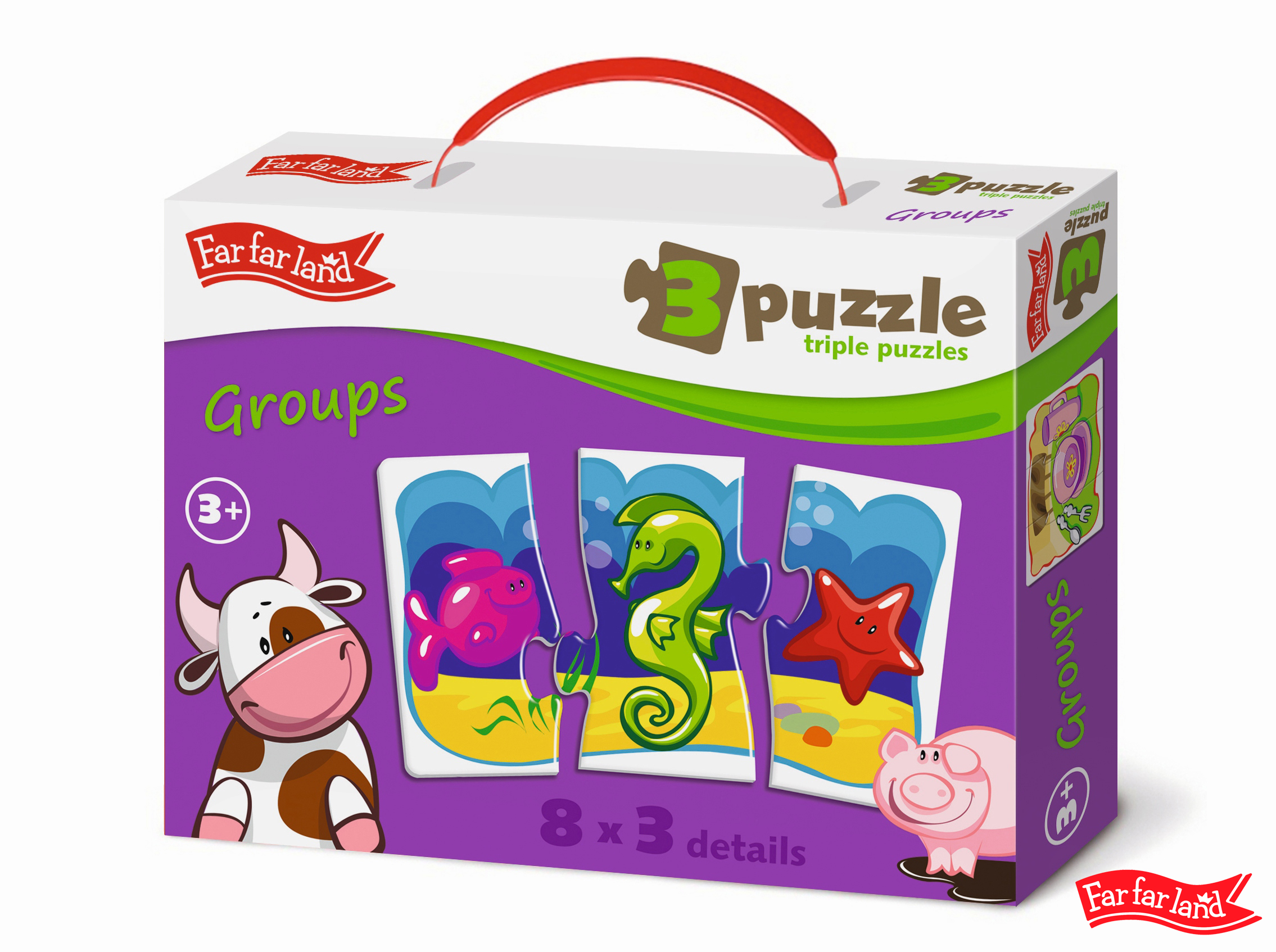 Far Far Land Puzzle trojice skupinky. Balení obsahuje 8 puzzle obrázků, které se skládají ze 3 dílků (vyobrazují trojice k sobě patřících předmětů nebo postaviček).