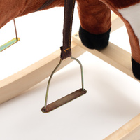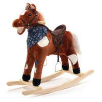 Neobyčejně krásný houpací koník s červeným šátkem na krku. Po zmáčknutí oušek koník zavrtí ocáskem, otevírá ústa, vydává zvuky klusajícího koně nebo zpívá písničku. Pohodlné sedlo, pevná uzda, dřevěné rukojeti nebo kovové třmeny zajistí vašim kovbojům ještě větší stabilitu a komfort během houpání. Je vyroben z měkkého plyšového materiálu, pevné dřevěné lišty nebo rukojeti lze snadno odšroubovat. Baterie se vkládají do pouzdra umístěného na bříšku koníka.
