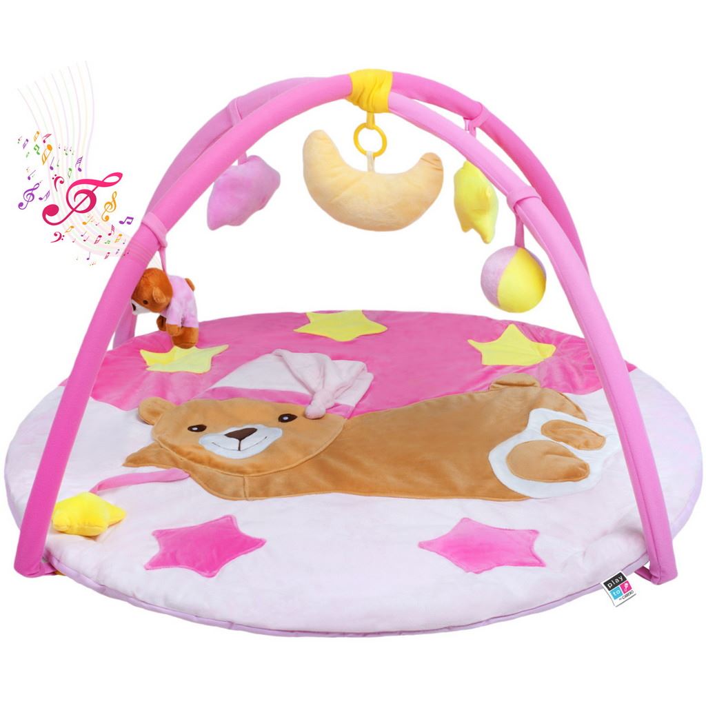 Krásná originální vzdělávací hrací deka s melodií PlayTo s hrazdou rozvíjí dětskou představivost díky poznávaní barev a tvarů. Hrací deka v krásné zářivé barvě s motivem medvídka. Rozvíjí smysly hmatu, zraku i sluchu díky šustícím a pohyblivým částem. Příjemný a měkký materiál umožňuje pohodlné ležení na bříšku nebo zádech a umožňuje svobodu pohybu Vašeho dítěte. Miminko tak může získat bezpečný útulnější prostor a motivuje ke zvedání děťátka. Hračky lze z hrazdičky snadno sundat. Každé miminko si na dece najde svou oblíbenou hračku. Patří tu zrcadlo, suštící části, plyšová hračka s pískátkem, plyšová hračka s rolničkou. V měsíčku je ukrytý hrací modul, který po stlačení hraje melodie. Lze ji použít doma i venku. Díky jednoduché konstrukci a dodávané tašce lze deku lehce přenášet. Hračky lze odepnout a používat samostatně. Pořiďte Vašemu miminku pohádkové místo pro hraní i odpočinek. Pro PlayTo je důležitá vaše spokojenost a pohodlí vašeho miminka. Právě proto vám nabízíme tuto roztomilou, pohodlnou, krásně barevnou a velmi měkoučkou hrací deku. Nadýchaná jemňoučká a semišková hrací deka poskytne miminku dokonalý komfort. Pokud deku zrovna nepoužíváte, snadno ji složíte a uchováte tak před prachem nebo případným poškozením. Deku rozložíte zpět během minutky.