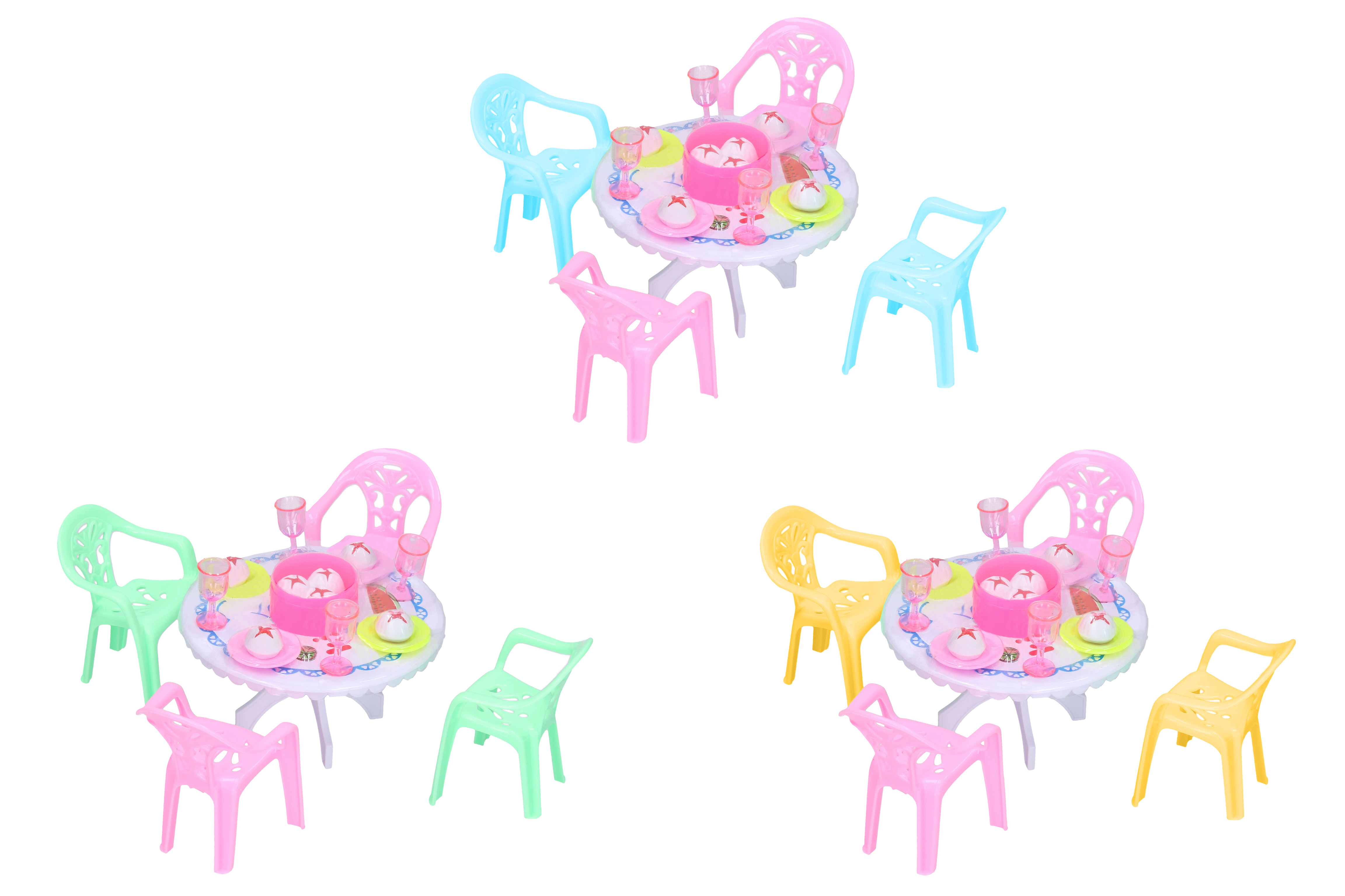 Barevný jídelní set pro panenky nesmí chybět ve tvém pokojíčku! Připrav pro panenky výborný oběd s dezertem!  Obsah balení: stoleček (10,5 cm) 4 židličky 4 skleničky 4 talířky se zákuskem 1 miska se zákusky Doporučený věk: od 3 let