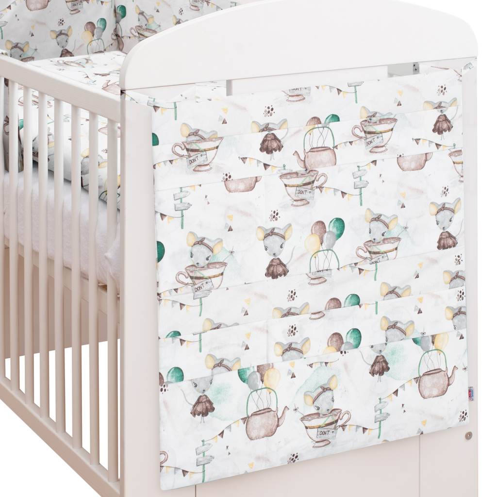 Kapsář na postýlku české značky New Baby Mouse Mia. Krásný, kvalitní a praktický kapsář na postýlku o rozměrech 58x58 cm bude vašim ideálním pomocníkem na odkládání všeho potřebného pro miminko. Díky univerzálním pastelovým barvám se bude skvěle hodit do pokojíku jakéhokoliv typu. Složení:100% bavlna. Výplň:antialergické vlákno-100% polyester.