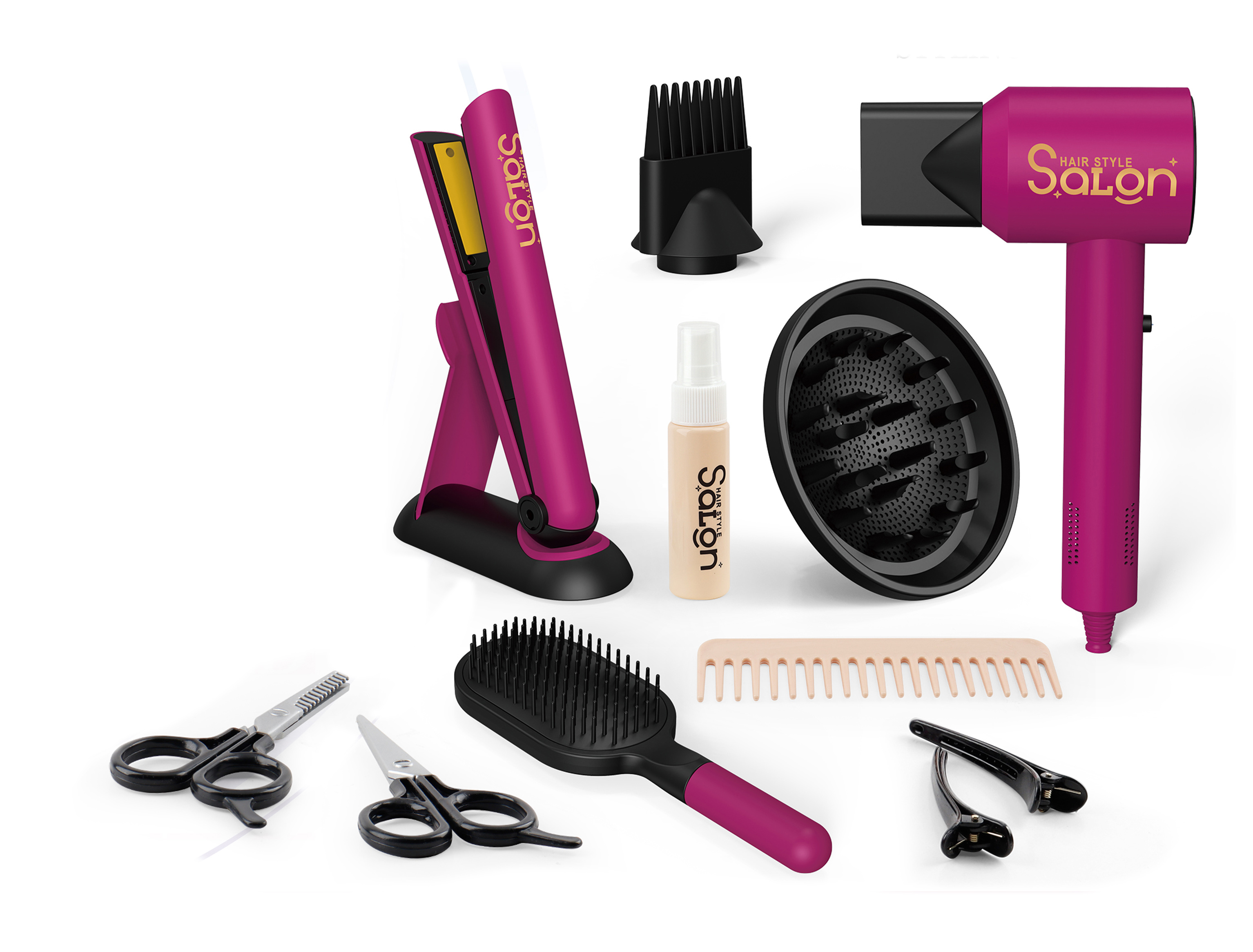 Kosmetický set s fénem a žehličkou set. Baterie do fénu 2xAA nejsou součástí, baterie do žehličky 2xAAA nejsou součástí. Obsahuje fén, žehličku, kartáč, hřeben, 2x nůžky, 2x sponky, sprej, nástavce.