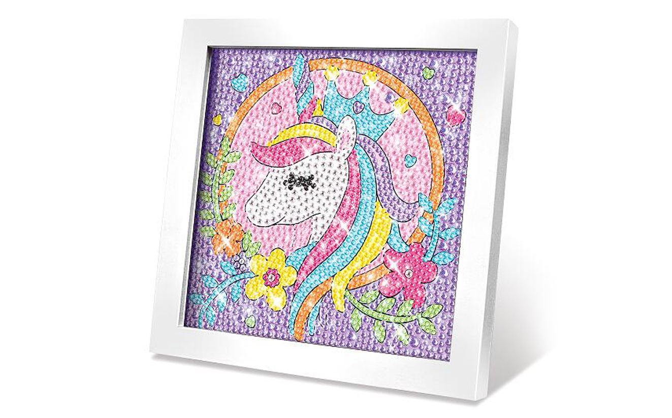 Kreativní set obraz s kamínky jednorožec. Velikost 17,5x17,5x1,5cm. Obsahuje misku na kamínky, pero na nabírání a umísťování kamínků, kamínky různých barev, vosk, rámeček. Postup: z obrázku sloupněte folii, špičku přiloženého pera přiložte na vosk, perem naberte kamínek, umístěte ho na obraz.