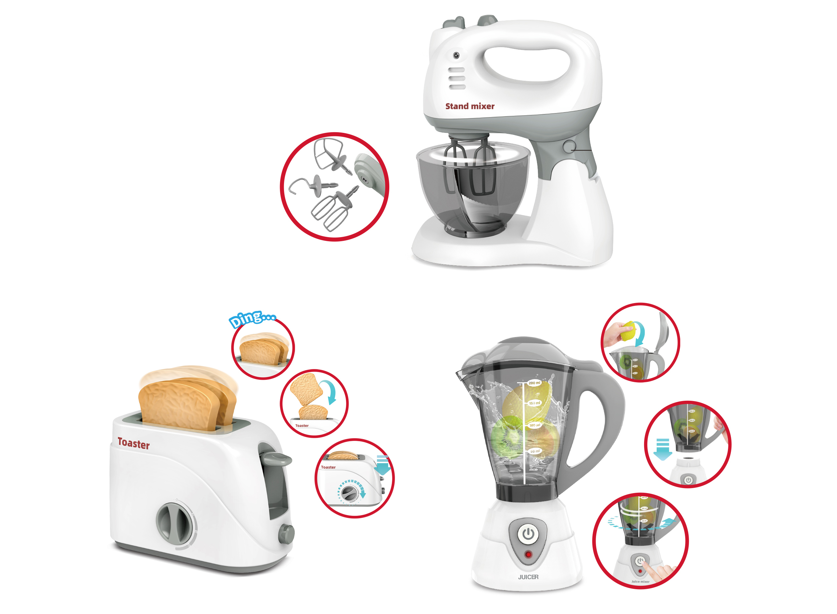 Kuchyňské spotřebiče set s efekty. Mixér s ovocem: on/off přepínač baterie 2xAA nejsou součástí, rozměry: 11x14x23cm, světelné efekty. návod na použití na obale. Nádoba je odnímatelná.