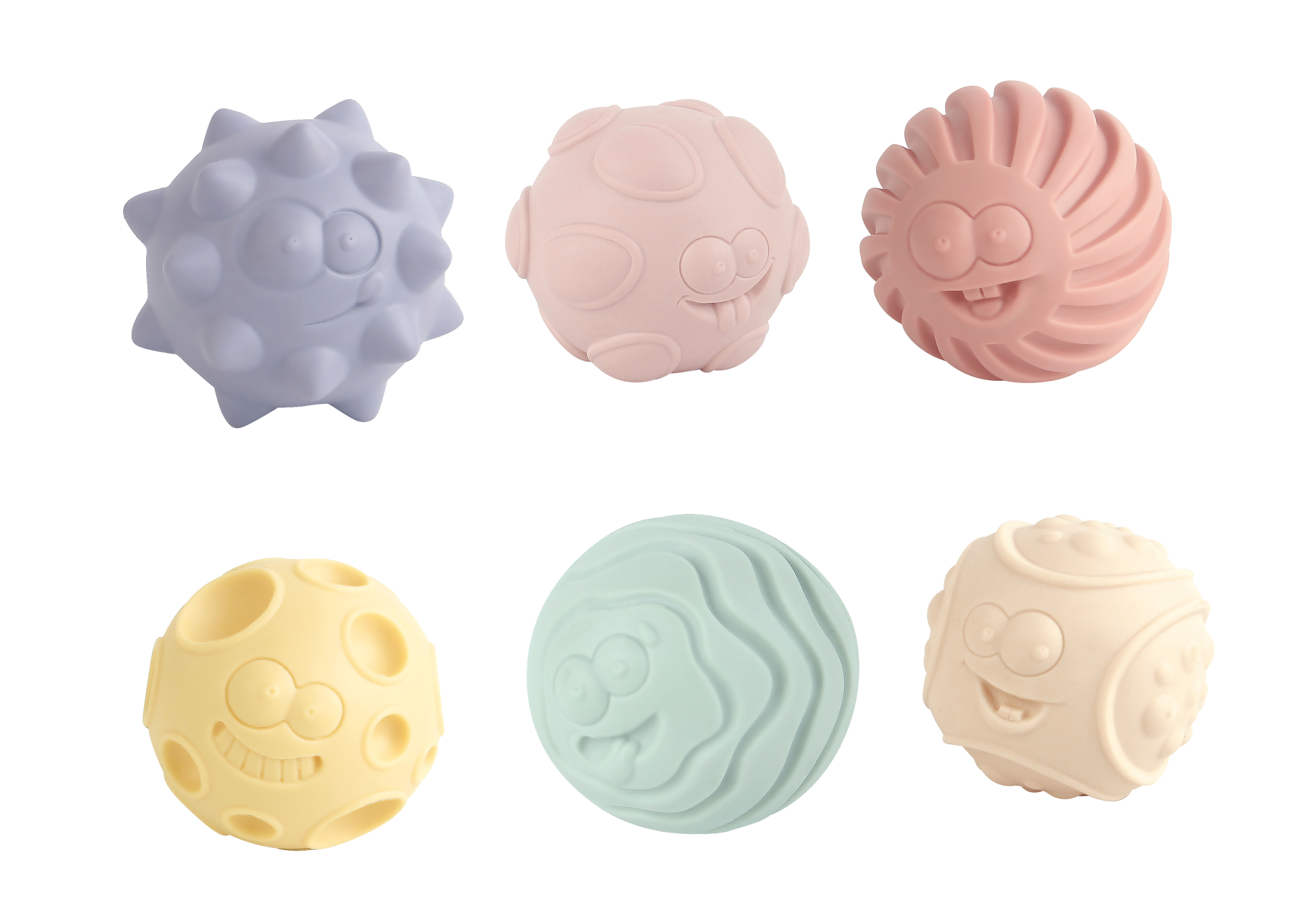 Míčky motorické. Velikost 6cm. Obsahuje 6ks měkkých míčků s různými povrchy. Při zmáčknutí píská.