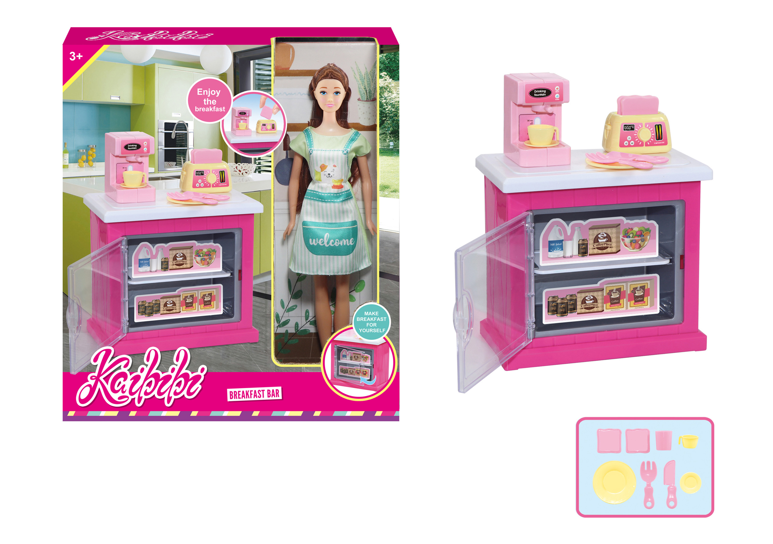 Panenka kuchařka. Velikost panenky 30cm. Obsahuje panenku, kuchyňskou skříňku, kávovar, topinkovač a další doplňky.
