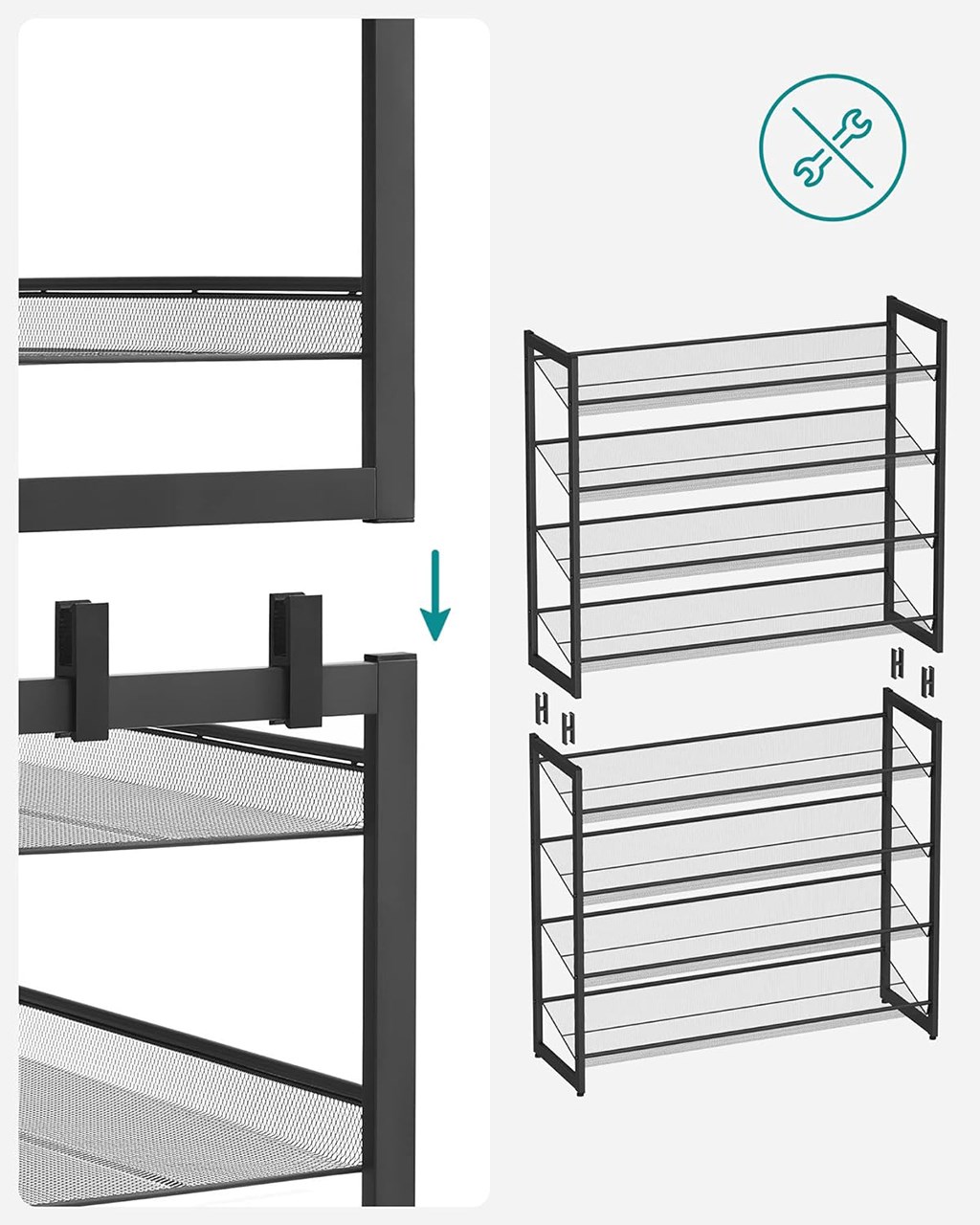 Obsahuje osm polic na boty (2 spojené regály po 4 police), které dle velikosti obuvi pojmou až 40 párů.