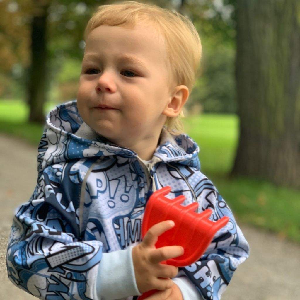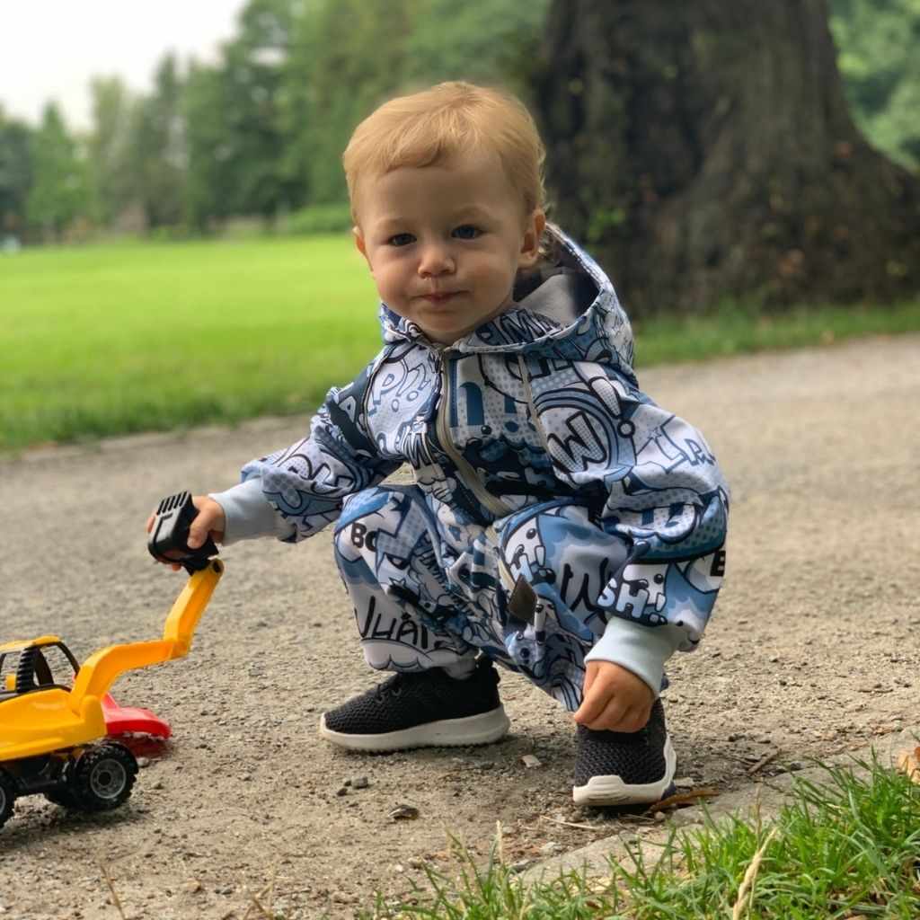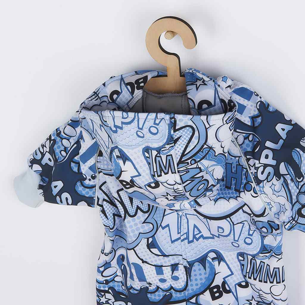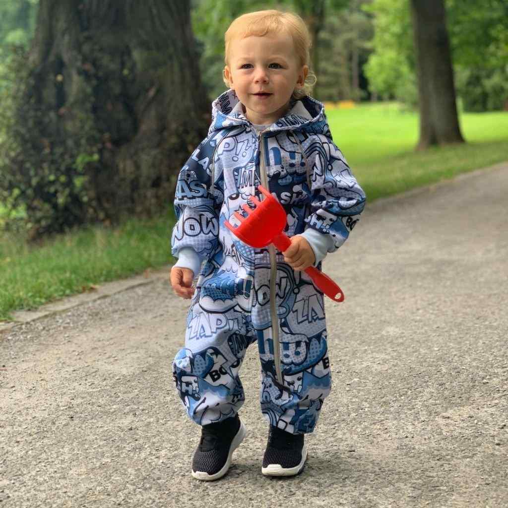 Nápaditý softshellový kojenecký overal New Baby. Overal je celopotištěný dětským vzorem. Overálek je vyroben v České republice z kvalitního materiálu softshell. Materiál je hladký, elestický, měkký a příjemný na dotek. Do určitého stupně je také voděodolný, nenasakuje vodu a je odolný vůči znečištění. Praktické zapínání na zip po celé délce velmi usnadní oblékání a přebalování. Zip je po celé délce podšitý látkou, a tím je zamezeno profukování větru na pokožku miminka. Kombinéza má praktickou kapuci, širší pružné lemy na rukách a nohavičkách a celá vnitřní strana je zateplená krátko střiženým polarem, který zvyšuje komfort nošení a zajišťuje teplo. Na rukávcích jsou našité reflexní paspulky. Softshellový overálek je vhodný jako sportovní oblečení, je odolný větru a zároveň prodyšný. Miminko se bude cítit velmi pohodlně a příjemně.