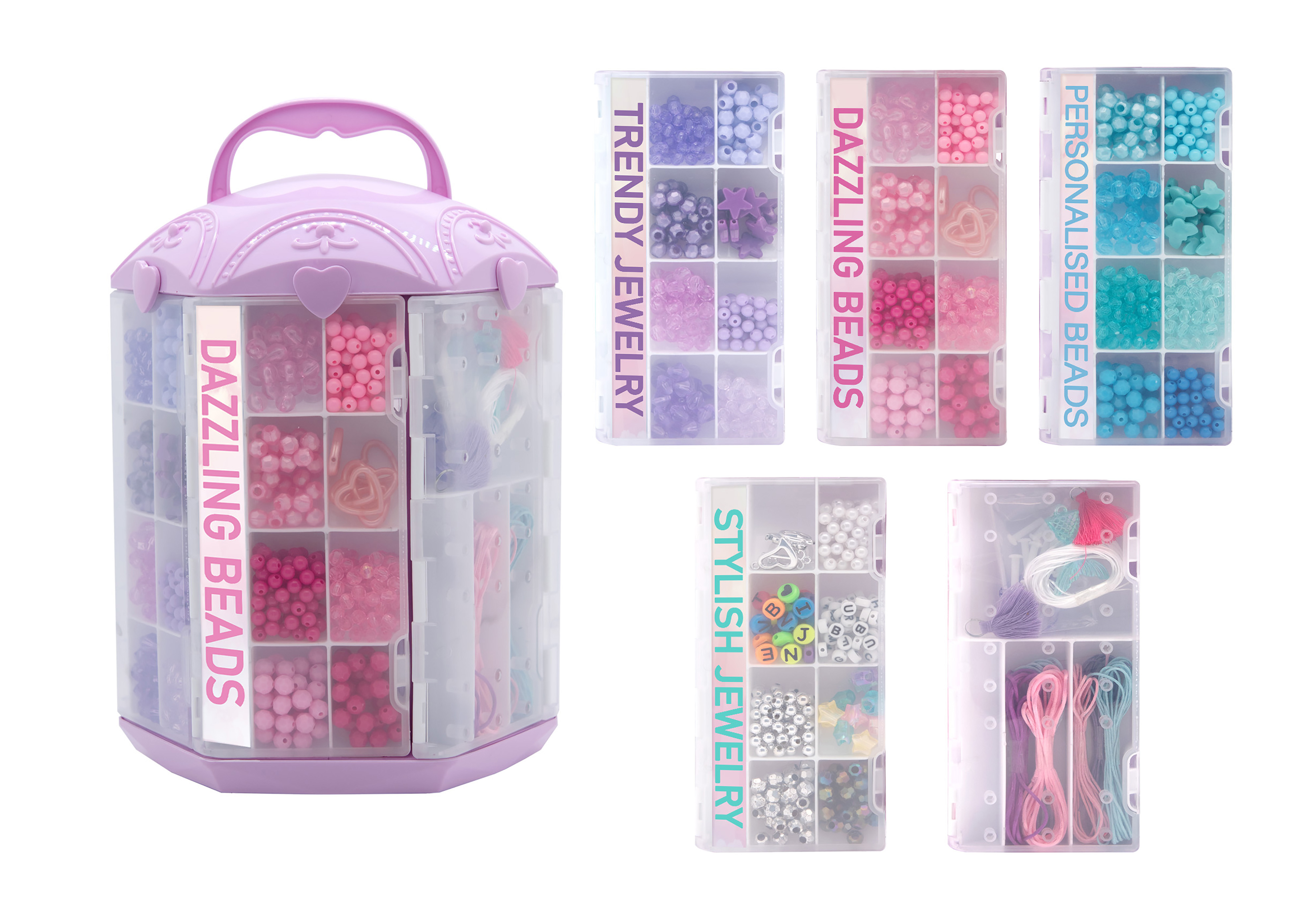 Tvorba náramků skříňka. Velikost 27cm. Obsahuje 5 krabiček s korálky a provázky na tvorbu náramků. Krabičky se dají umístit svisle na skříňku pro lepší organizaci korálků. Skříňka má místo na hotové náramky. madlo na přenášení.