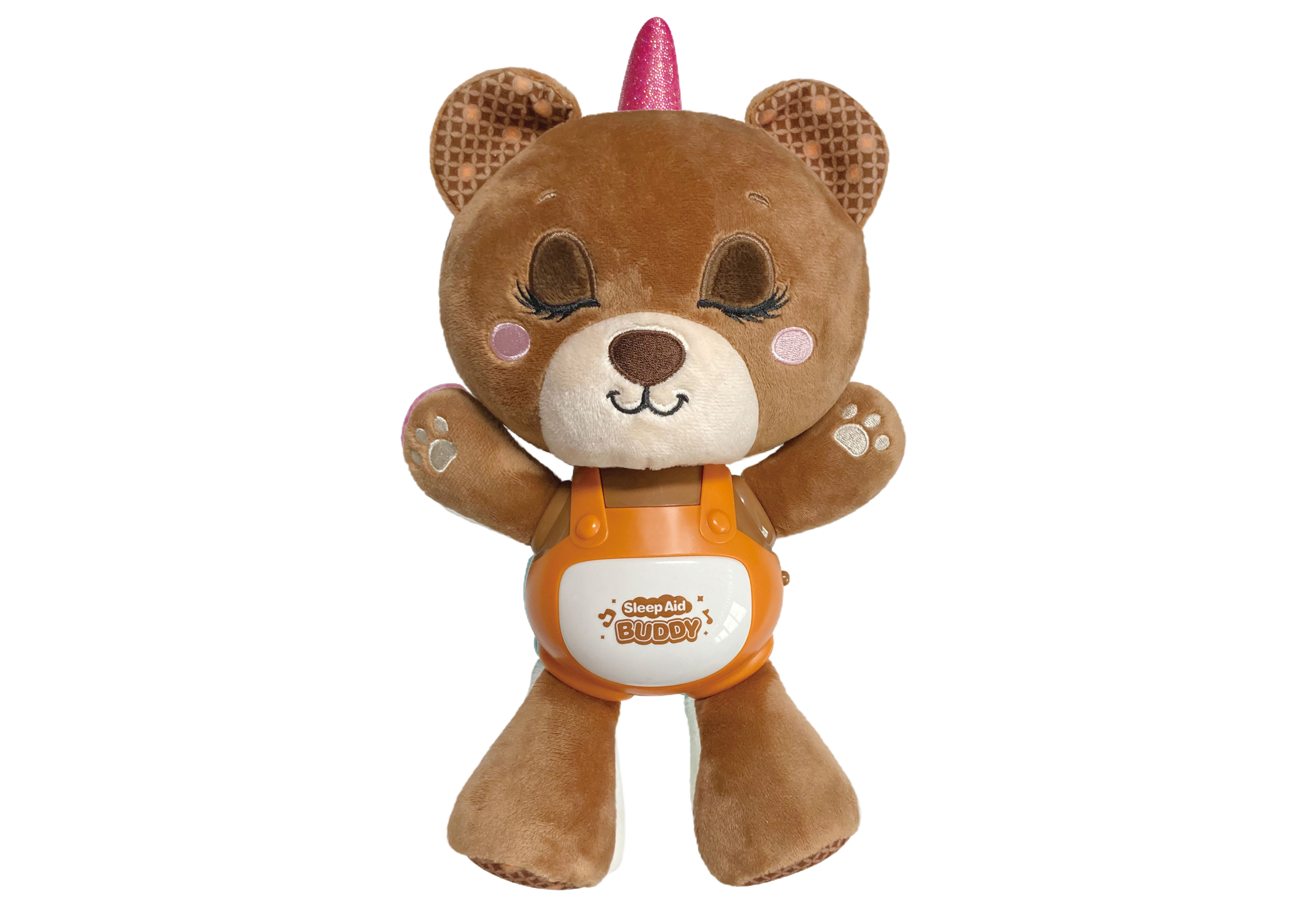 Usínáček medvěd. Velikost 29cm. baterie 3xAAA nejsou součástí. Přepínač on/off na boku zvířátka. Stisknutím bříška se spouští zvukové efekty- 1. stisknutí ukolébavka, 2. stisknutí uklidňující hudba, 3. stisknutí chrápání, 4. stisknutí pouze světlo, 5. stitknutí vypnutí, 6. stisknutí cycle