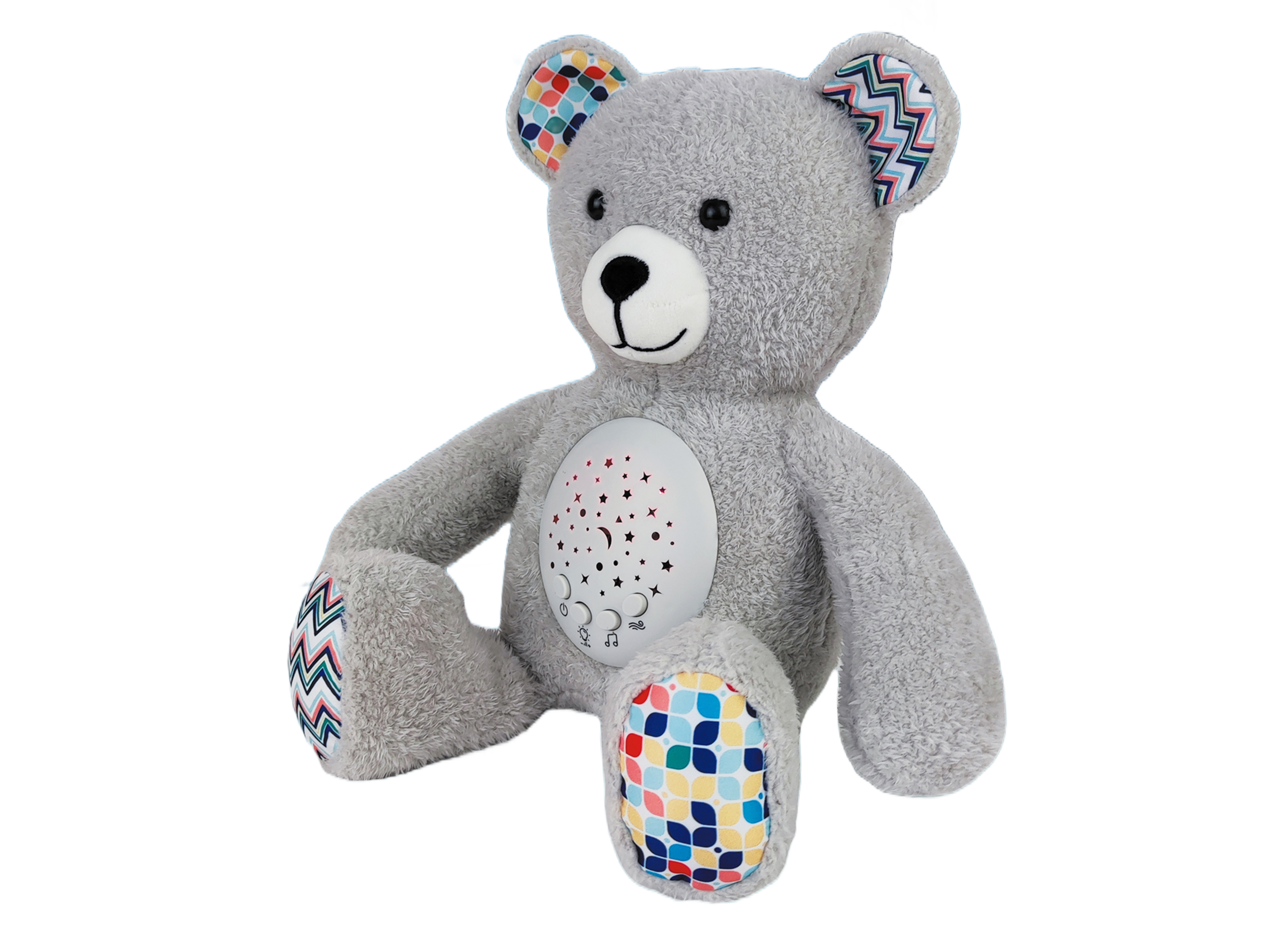Usínáček s projekcí medvěd. Velikost 24cm. Baterie 3xAA nejsou součástí. Tlačítko ON//OFF přidržením po dobu 2s se zapne/vypne. Tlačítko světla jedním stisknutím rozsvítí projekci, další stisknutí zvyšují intenzitu svícení a 4.stisknutím se zhasne. Tlačítko s notou spouští ukolébavky. Celkem 7 písniček, které se přepínají opětovným stisknutím. Tlačítko s vlnou zapíná bílý šum. Stisknutím se spustí jeden ze tří bílých šumů, který trvá vždy 30min a poté se vypne. Další bílý šum se spustí až po stisknutí tlačítka.