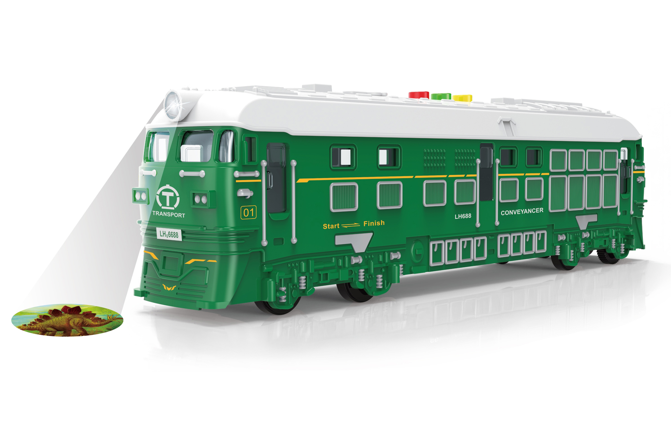 Vlak na setrvačník s efekty a projekcí zelený. Rozměry 33x8x6 cm. Vydává světelné a zvukové efekty, projekce. Aktivace tlačítky na střeše (zvuky vlaku a železnice). Baterie 3xAG13, součástí balení.