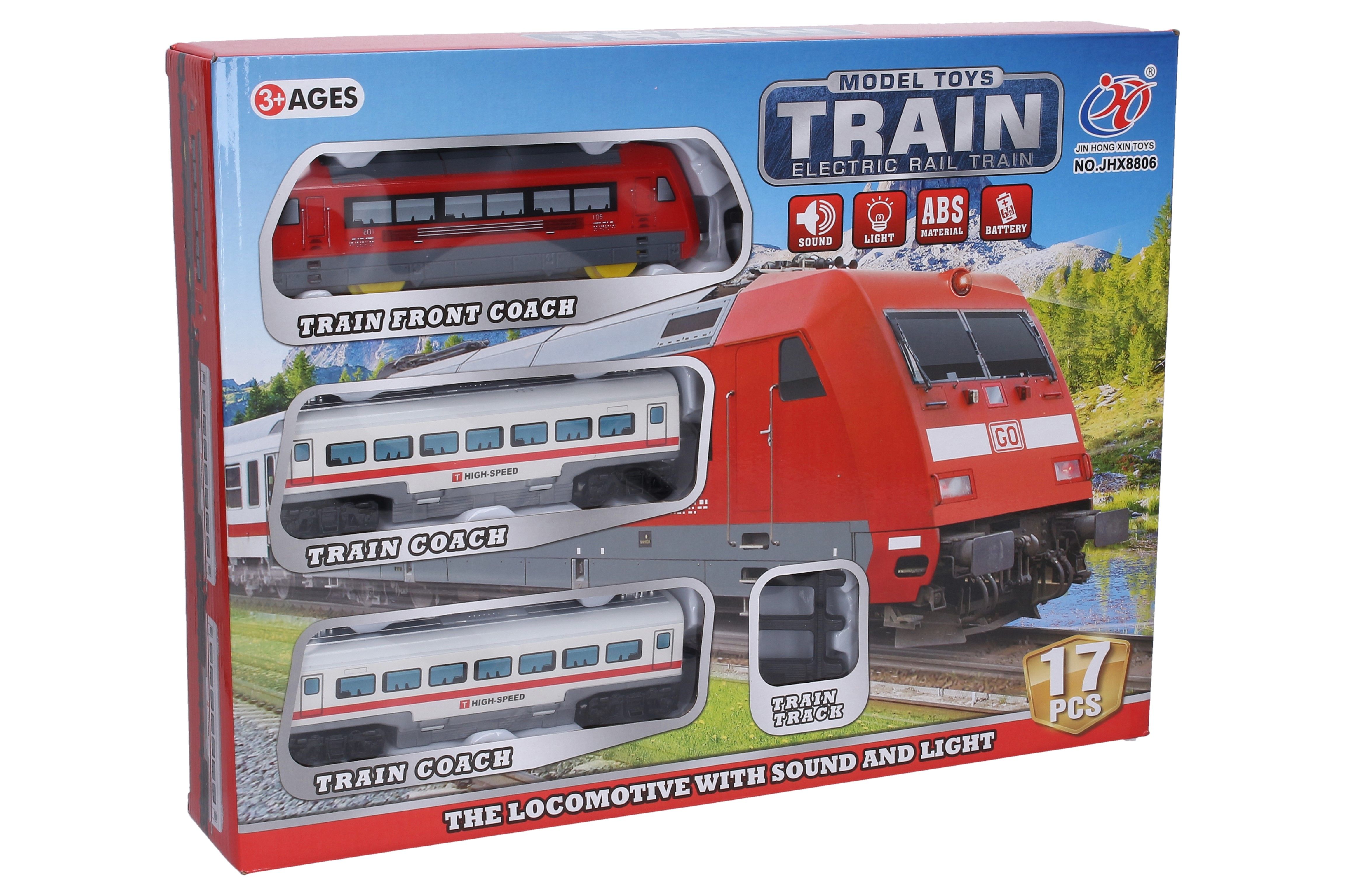 Vlak s efekty set, trať 88 cm, mašinka 18 cm. Rozměry vlaku 18x5x5 cm. Světelné, zvukové a pohybové efekty. 3xAA baterie nejsou součástí.